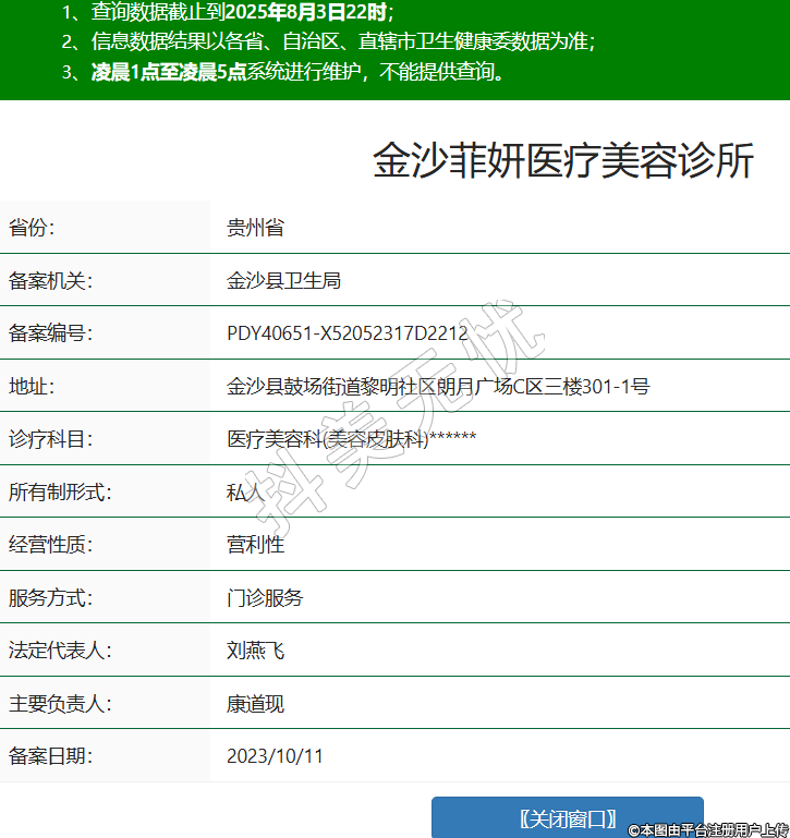 省份:貴州省備案機(jī)關(guān):金沙縣衛(wèi)生局備案編號(hào):PDY40651-X52052317D2212地址:金沙縣鼓場(chǎng)街道黎明社區(qū)朗月廣場(chǎng)C區(qū)三樓301-1號(hào)診療科目:醫(yī)療美容科(美容皮膚科)******所有制形式:私人經(jīng)營性質(zhì):營利性服務(wù)方式:門診服務(wù)法定代表人:劉燕飛主要負(fù)責(zé)人:康道現(xiàn)備案日期:2023/10/11 -