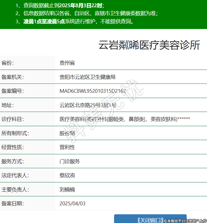 省份:貴州省備案機關(guān):貴陽市云巖區(qū)衛(wèi)生健康局備案編號:MAD6C8WL952010315D2162地址:云巖區(qū)北京路29號3層1號診療科目:醫(yī)療美容科(美容外科[眼瞼類、鼻部類]、美容皮膚科)******所有制形式:股份制經(jīng)營性質(zhì):營利性服務(wù)方式:門診服務(wù)法定代表人:蔡欣洧主要負(fù)責(zé)人:劉楠楠備案日期:2025/04/03 -