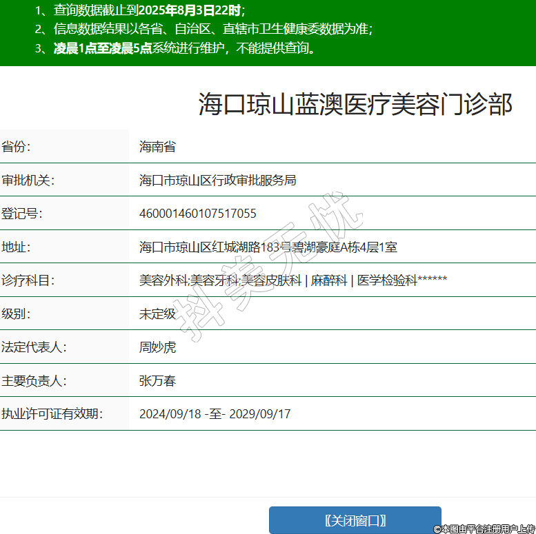 省份:海南省審批機(jī)關(guān):??谑协偵絽^(qū)行政審批服務(wù)局登記號:460001460107517055地址:??谑协偵絽^(qū)紅城湖路183號碧湖豪庭A棟4層1室診療科目:美容外科;美容牙科;美容皮膚科 | 麻醉科 | 醫(yī)學(xué)檢驗科******級別:未定級法定代表人:周妙虎主要負(fù)責(zé)人:張萬春執(zhí)業(yè)許可證有效期:2024/09/18 -至- 2029/09/17 -