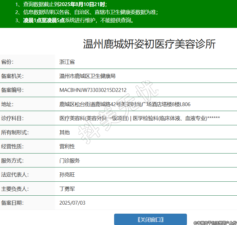 省份:浙江省備案機(jī)關(guān):溫州市鹿城區(qū)衛(wèi)生健康局備案編號:MACBHNJW733030215D2212地址:鹿城區(qū)松臺街道鹿城路42號美美時(shí)尚廣場酒店塔樓8樓L806診療科目:醫(yī)療美容科(美容外科一級項(xiàng)目) | 醫(yī)學(xué)檢驗(yàn)科(臨床體液、血液專業(yè))******所有制形式:其他經(jīng)營性質(zhì):營利性服務(wù)方式:門診服務(wù)法定代表人:孫克旺主要負(fù)責(zé)人:丁勇軍備案日期:2025/07/03 -