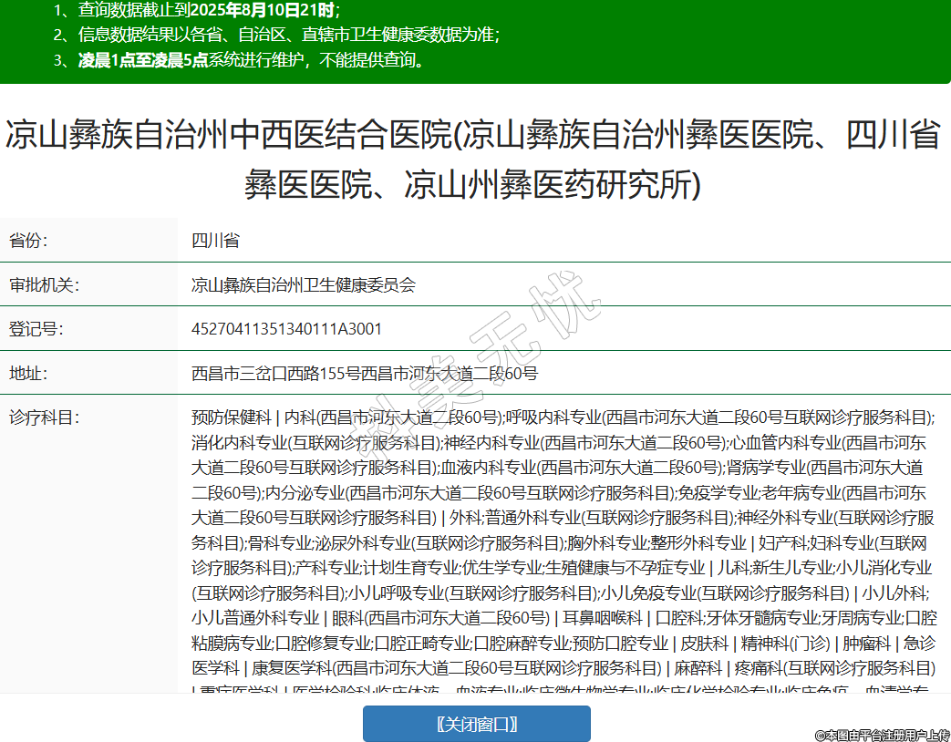 省份:四川省審批機關:涼山彝族自治州衛(wèi)生健康委員會登記號:45270411351340111A3001地址:西昌市三岔口西路155號西昌市河東大道二段60號診療科目:預防保健科 | 內(nèi)科(西昌市河東大道二段60號);呼吸內(nèi)科專業(yè)(西昌市河東大道二段60號互聯(lián)網(wǎng)診療服務科目);消化內(nèi)科專業(yè)(互聯(lián)網(wǎng)診療服務科目);神經(jīng)內(nèi)科專業(yè)(西昌市河東大道二段60號);心血管內(nèi)科專業(yè)(西昌市河東大道二段60號互聯(lián)網(wǎng)診療服務科目);血液內(nèi)科專業(yè)(西昌市河東大道二段60號);腎病學專業(yè)(西昌市河東大道二段60號);內(nèi)分泌專業(yè)(西昌市河東大道二段60號互聯(lián)網(wǎng)診療服務科目);免疫學專業(yè);老年病專業(yè)(西昌市河東大道二段60號互聯(lián)網(wǎng)診療服務科目) | 外科;普通外科專業(yè)(互聯(lián)網(wǎng)診療服務科目);神經(jīng)外科專業(yè)(互聯(lián)網(wǎng)診療服務科目);骨科專業(yè);泌尿外科專業(yè)(互聯(lián)網(wǎng)診療服務科目);胸外科專業(yè);整形外科專業(yè) | 婦產(chǎn)科;婦科專業(yè)(互聯(lián)網(wǎng)診療服務科目);產(chǎn)科專業(yè);計劃生育專業(yè);優(yōu)生學專業(yè);生殖健康與不孕癥專業(yè) | 兒科;新生兒專業(yè);小兒消化專業(yè)(互聯(lián)網(wǎng)診療服務科目);小兒呼吸專業(yè)(互聯(lián)網(wǎng)診療服務科目);小兒免疫專業(yè)(互聯(lián)網(wǎng)診療服務科目) | 小兒外科;小兒普通外科專業(yè) | 眼科(西昌市河東大道二段60號) | 耳鼻咽喉科 | 口腔科;牙體牙髓病專業(yè);牙周病專業(yè);口腔粘膜病專業(yè);口腔修復專業(yè);口腔正畸專業(yè);口腔麻醉專業(yè);預防口腔專業(yè) | 皮膚科 | 精神科(門診) | 腫瘤科 | 急診醫(yī)學科 | 康復醫(yī)學科(西昌市河東大道二段60號互聯(lián)網(wǎng)診療服務科目) | 麻醉科 | 疼痛科(互聯(lián)網(wǎng)診療服務科目) | 重癥醫(yī)學科 | 醫(yī)學檢驗科;臨床體液、血液專業(yè);臨床微生物學專業(yè);臨床化學檢驗專業(yè);臨床免疫、血清學專業(yè);臨床細胞分子遺傳學專業(yè) | 病理科 | 醫(yī)學影像科(西昌市河東大道二段60號);X線診斷專業(yè);CT診斷專業(yè);磁共振成像診斷專業(yè);超聲診斷專業(yè)(西昌市河東大道二段60號);心電診斷專業(yè)(西昌市河東大道二段60號);腦電及腦血流圖診斷專業(yè);神經(jīng)肌肉電圖專業(yè);介入放射學專業(yè) | 中醫(yī)科;內(nèi)科專業(yè)(互聯(lián)網(wǎng)診療服務科目);肛腸科專業(yè)(西昌市河東大道二段60號);針灸科專業(yè)(西昌市河東大道二段60號);推拿科專業(yè)(西昌市河東大道二段60號);康復醫(yī)學專業(yè)(西昌市河東大道二段60號);急診科專業(yè) | 中西醫(yī)結(jié)合科******級別:三級法定代表人:樊鶴瑩主要負責人:樊鶴瑩執(zhí)業(yè)許可證有效期:2020/05/13 -至- 2035/05/13 -