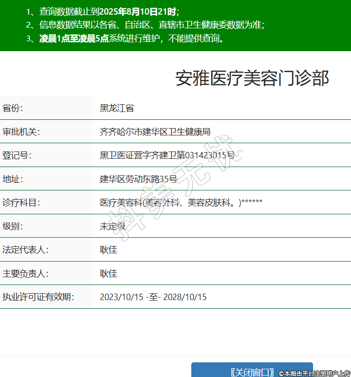 省份:黑龍江省審批機關:齊齊哈爾市建華區(qū)衛(wèi)生健康局登記號:黑衛(wèi)醫(yī)證營字齊建衛(wèi)第031423015號地址:建華區(qū)勞動東路35號診療科目:醫(yī)療美容科(美容外科、美容皮膚科。)******級別:未定級法定代表人:耿佳主要負責人:耿佳執(zhí)業(yè)許可證有效期:2023/10/15 -至- 2028/10/15 -