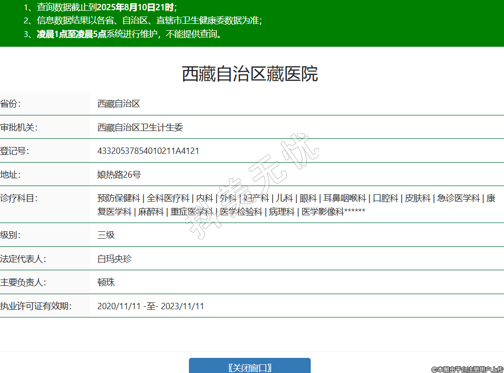 省份:西藏自治區(qū)審批機關:西藏自治區(qū)衛(wèi)生計生委登記號:43320537854010211A4121地址:娘熱路26號診療科目:預防保健科 | 全科醫(yī)療科 | 內科 | 外科 | 婦產科 | 兒科 | 眼科 | 耳鼻咽喉科 | 口腔科 | 皮膚科 | 急診醫(yī)學科 | 康復醫(yī)學科 | 麻醉科 | 重癥醫(yī)學科 | 醫(yī)學檢驗科 | 病理科 | 醫(yī)學影像科******級別:三級法定代表人:白瑪央珍主要負責人:頓珠執(zhí)業(yè)許可證有效期:2020/11/11 -至- 2023/11/11 -