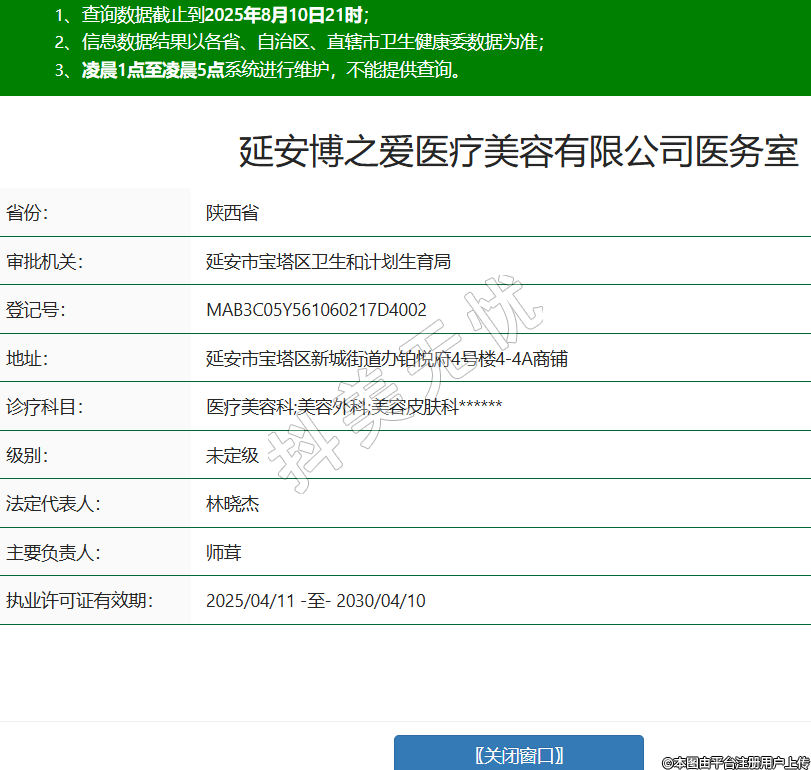 省份:陜西省審批機(jī)關(guān):延安市寶塔區(qū)衛(wèi)生和計(jì)劃生育局登記號(hào):MAB3C05Y561060217D4002地址:延安市寶塔區(qū)新城街道辦鉑悅府4號(hào)樓4-4A商鋪診療科目:醫(yī)療美容科;美容外科;美容皮膚科******級(jí)別:未定級(jí)法定代表人:林曉杰主要負(fù)責(zé)人:師茸執(zhí)業(yè)許可證有效期:2025/04/11 -至- 2030/04/10 -