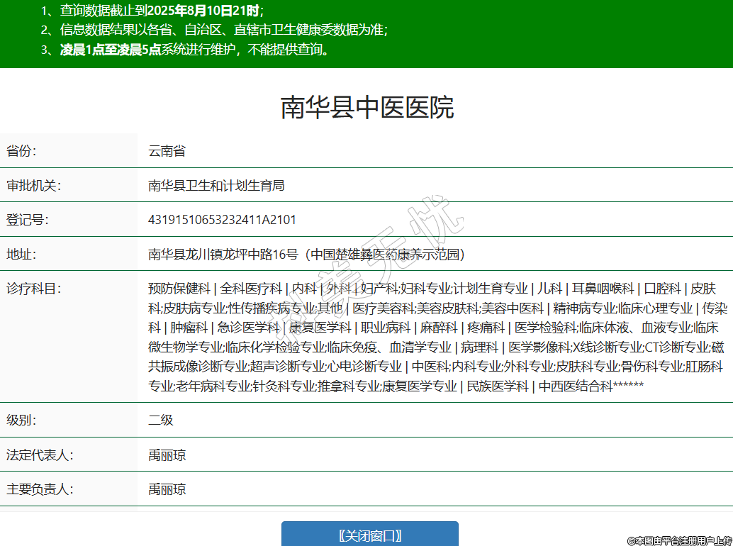 省份:云南省審批機(jī)關(guān):南華縣衛(wèi)生和計(jì)劃生育局登記號(hào):43191510653232411A2101地址:南華縣龍川鎮(zhèn)龍坪中路16號(hào)(中國楚雄彝醫(yī)藥康養(yǎng)示范園)診療科目:預(yù)防保健科 | 全科醫(yī)療科 | 內(nèi)科 | 外科 | 婦產(chǎn)科;婦科專業(yè);計(jì)劃生育專業(yè) | 兒科 | 耳鼻咽喉科 | 口腔科 | 皮膚科;皮膚病專業(yè);性傳播疾病專業(yè);其他 | 醫(yī)療美容科;美容皮膚科;美容中醫(yī)科 | 精神病專業(yè);臨床心理專業(yè) | 傳染科 | 腫瘤科 | 急診醫(yī)學(xué)科 | 康復(fù)醫(yī)學(xué)科 | 職業(yè)病科 | 麻醉科 | 疼痛科 | 醫(yī)學(xué)檢驗(yàn)科;臨床體液、血液專業(yè);臨床微生物學(xué)專業(yè);臨床化學(xué)檢驗(yàn)專業(yè);臨床免疫、血清學(xué)專業(yè) | 病理科 | 醫(yī)學(xué)影像科;X線診斷專業(yè);CT診斷專業(yè);磁共振成像診斷專業(yè);超聲診斷專業(yè);心電診斷專業(yè) | 中醫(yī)科;內(nèi)科專業(yè);外科專業(yè);皮膚科專業(yè);骨傷科專業(yè);肛腸科專業(yè);老年病科專業(yè);針灸科專業(yè);推拿科專業(yè);康復(fù)醫(yī)學(xué)專業(yè) | 民族醫(yī)學(xué)科 | 中西醫(yī)結(jié)合科******級(jí)別:二級(jí)法定代表人:禹麗瓊主要負(fù)責(zé)人:禹麗瓊執(zhí)業(yè)許可證有效期:2025/04/16 -至- 2037/12/30 -