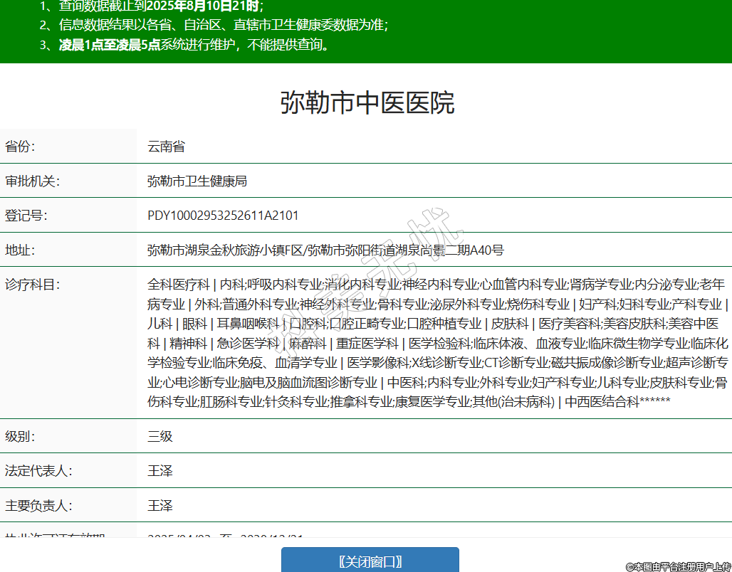 省份:云南省審批機(jī)關(guān):彌勒市衛(wèi)生健康局登記號:PDY10002953252611A2101地址:彌勒市湖泉金秋旅游小鎮(zhèn)F區(qū)/彌勒市彌陽街道湖泉尚景二期A40號診療科目:全科醫(yī)療科 | 內(nèi)科;呼吸內(nèi)科專業(yè);消化內(nèi)科專業(yè);神經(jīng)內(nèi)科專業(yè);心血管內(nèi)科專業(yè);腎病學(xué)專業(yè);內(nèi)分泌專業(yè);老年病專業(yè) | 外科;普通外科專業(yè);神經(jīng)外科專業(yè);骨科專業(yè);泌尿外科專業(yè);燒傷科專業(yè) | 婦產(chǎn)科;婦科專業(yè);產(chǎn)科專業(yè) | 兒科 | 眼科 | 耳鼻咽喉科 | 口腔科;口腔正畸專業(yè);口腔種植專業(yè) | 皮膚科 | 醫(yī)療美容科;美容皮膚科;美容中醫(yī)科 | 精神科 | 急診醫(yī)學(xué)科 | 麻醉科 | 重癥醫(yī)學(xué)科 | 醫(yī)學(xué)檢驗(yàn)科;臨床體液、血液專業(yè);臨床微生物學(xué)專業(yè);臨床化學(xué)檢驗(yàn)專業(yè);臨床免疫、血清學(xué)專業(yè) | 醫(yī)學(xué)影像科;X線診斷專業(yè);CT診斷專業(yè);磁共振成像診斷專業(yè);超聲診斷專業(yè);心電診斷專業(yè);腦電及腦血流圖診斷專業(yè) | 中醫(yī)科;內(nèi)科專業(yè);外科專業(yè);婦產(chǎn)科專業(yè);兒科專業(yè);皮膚科專業(yè);骨傷科專業(yè);肛腸科專業(yè);針灸科專業(yè);推拿科專業(yè);康復(fù)醫(yī)學(xué)專業(yè);其他(治未病科) | 中西醫(yī)結(jié)合科******級別:三級法定代表人:王澤主要負(fù)責(zé)人:王澤執(zhí)業(yè)許可證有效期:2025/04/03 -至- 2038/12/21 -