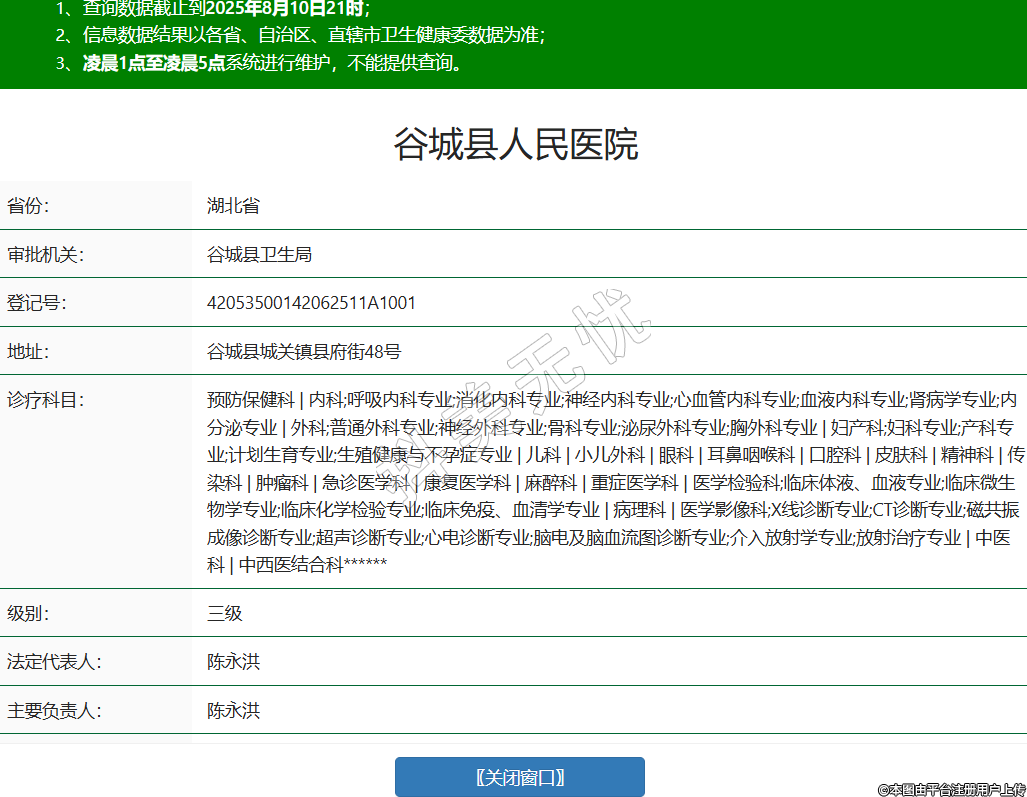 省份:湖北省審批機(jī)關(guān):谷城縣衛(wèi)生局登記號(hào):42053500142062511A1001地址:谷城縣城關(guān)鎮(zhèn)縣府街48號(hào)診療科目:預(yù)防保健科 | 內(nèi)科;呼吸內(nèi)科專業(yè);消化內(nèi)科專業(yè);神經(jīng)內(nèi)科專業(yè);心血管內(nèi)科專業(yè);血液內(nèi)科專業(yè);腎病學(xué)專業(yè);內(nèi)分泌專業(yè) | 外科;普通外科專業(yè);神經(jīng)外科專業(yè);骨科專業(yè);泌尿外科專業(yè);胸外科專業(yè) | 婦產(chǎn)科;婦科專業(yè);產(chǎn)科專業(yè);計(jì)劃生育專業(yè);生殖健康與不孕癥專業(yè) | 兒科 | 小兒外科 | 眼科 | 耳鼻咽喉科 | 口腔科 | 皮膚科 | 精神科 | 傳染科 | 腫瘤科 | 急診醫(yī)學(xué)科 | 康復(fù)醫(yī)學(xué)科 | 麻醉科 | 重癥醫(yī)學(xué)科 | 醫(yī)學(xué)檢驗(yàn)科;臨床體液、血液專業(yè);臨床微生物學(xué)專業(yè);臨床化學(xué)檢驗(yàn)專業(yè);臨床免疫、血清學(xué)專業(yè) | 病理科 | 醫(yī)學(xué)影像科;X線診斷專業(yè);CT診斷專業(yè);磁共振成像診斷專業(yè);超聲診斷專業(yè);心電診斷專業(yè);腦電及腦血流圖診斷專業(yè);介入放射學(xué)專業(yè);放射治療專業(yè) | 中醫(yī)科 | 中西醫(yī)結(jié)合科******級(jí)別:三級(jí)法定代表人:陳永洪主要負(fù)責(zé)人:陳永洪執(zhí)業(yè)許可證有效期:2008/10/15 -至- 2023/10/14 -