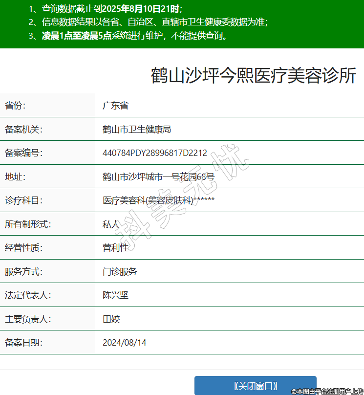 省份:廣東省備案機(jī)關(guān):鶴山市衛(wèi)生健康局備案編號(hào):440784PDY28996817D2212地址:鶴山市沙坪城市一號(hào)花園68號(hào)診療科目:醫(yī)療美容科(美容皮膚科)******所有制形式:私人經(jīng)營性質(zhì):營利性服務(wù)方式:門診服務(wù)法定代表人:陳興堅(jiān)主要負(fù)責(zé)人:田姣備案日期:2024/08/14 -