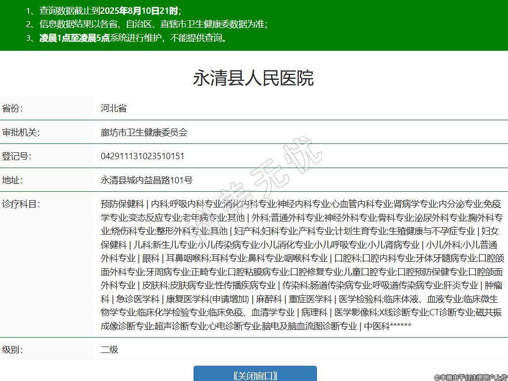 省份:河北省審批機(jī)關(guān):廊坊市衛(wèi)生健康委員會登記號:042911131023510151地址:永清縣城內(nèi)益昌路101號診療科目:預(yù)防保健科 | 內(nèi)科;呼吸內(nèi)科專業(yè);消化內(nèi)科專業(yè);神經(jīng)內(nèi)科專業(yè);心血管內(nèi)科專業(yè);腎病學(xué)專業(yè);內(nèi)分泌專業(yè);免疫學(xué)專業(yè);變態(tài)反應(yīng)專業(yè);老年病專業(yè);其他 | 外科;普通外科專業(yè);神經(jīng)外科專業(yè);骨科專業(yè);泌尿外科專業(yè);胸外科專業(yè);燒傷科專業(yè);整形外科專業(yè);其他 | 婦產(chǎn)科;婦科專業(yè);產(chǎn)科專業(yè);計劃生育專業(yè);生殖健康與不孕癥專業(yè) | 婦女保健科 | 兒科;新生兒專業(yè);小兒傳染病專業(yè);小兒消化專業(yè);小兒呼吸專業(yè);小兒腎病專業(yè) | 小兒外科;小兒普通外科專業(yè) | 眼科 | 耳鼻咽喉科;耳科專業(yè);鼻科專業(yè);咽喉科專業(yè) | 口腔科;口腔內(nèi)科專業(yè);牙體牙髓病專業(yè);口腔頜面外科專業(yè);牙周病專業(yè);正畸專業(yè);口腔粘膜病專業(yè);口腔修復(fù)專業(yè);兒童口腔專業(yè);口腔預(yù)防保健專業(yè);口腔頜面外科專業(yè) | 皮膚科;皮膚病專業(yè);性傳播疾病專業(yè) | 傳染科;腸道傳染病專業(yè);呼吸道傳染病專業(yè);肝炎專業(yè) | 腫瘤科 | 急診醫(yī)學(xué)科 | 康復(fù)醫(yī)學(xué)科(申請增加) | 麻醉科 | 重癥醫(yī)學(xué)科 | 醫(yī)學(xué)檢驗科;臨床體液、血液專業(yè);臨床微生物學(xué)專業(yè);臨床化學(xué)檢驗專業(yè);臨床免疫、血清學(xué)專業(yè) | 病理科 | 醫(yī)學(xué)影像科;X線診斷專業(yè);CT診斷專業(yè);磁共振成像診斷專業(yè);超聲診斷專業(yè);心電診斷專業(yè);腦電及腦血流圖診斷專業(yè) | 中醫(yī)科******級別:二級法定代表人:司志軍主要負(fù)責(zé)人:司志軍執(zhí)業(yè)許可證有效期:2022/01/04 -至- 2037/01/03 -