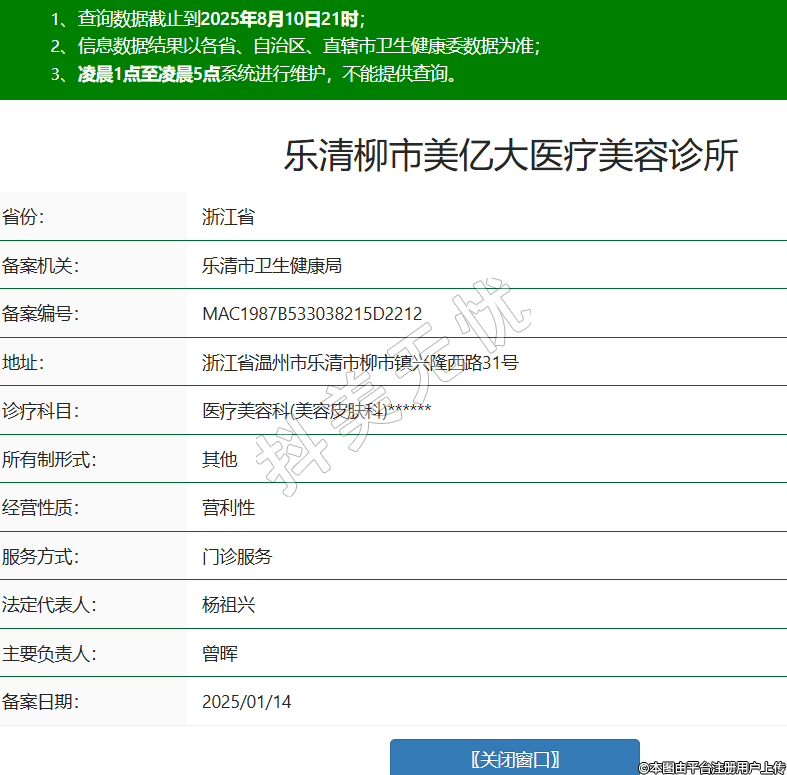 省份:浙江省備案機(jī)關(guān):樂清市衛(wèi)生健康局備案編號(hào):MAC1987B533038215D2212地址:浙江省溫州市樂清市柳市鎮(zhèn)興隆西路31號(hào)診療科目:醫(yī)療美容科(美容皮膚科)******所有制形式:其他經(jīng)營(yíng)性質(zhì):營(yíng)利性服務(wù)方式:門診服務(wù)法定代表人:楊祖興主要負(fù)責(zé)人:曾暉備案日期:2025/01/14 -