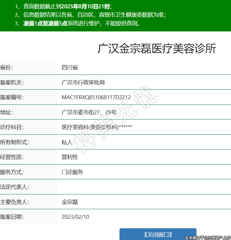 省份:四川省備案機(jī)關(guān):廣漢市行政審批局備案編號(hào):MAC1FRXQ851068117D2212地址:廣漢市麥?zhǔn)薪?7、29號(hào)診療科目:醫(yī)療美容科(美容皮膚科)******所有制形式:私人經(jīng)營(yíng)性質(zhì):營(yíng)利性服務(wù)方式:門診服務(wù)法定代表人:主要負(fù)責(zé)人:金宗磊備案日期:2023/02/10 -