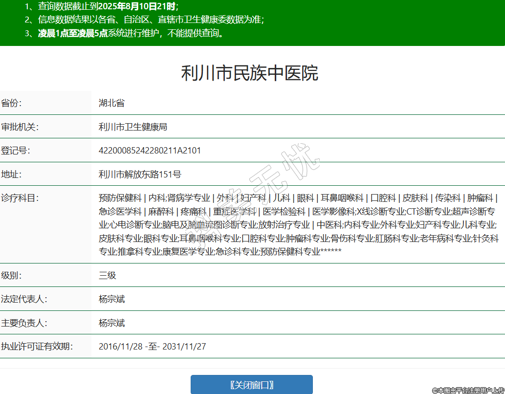 省份:湖北省審批機(jī)關(guān):利川市衛(wèi)生健康局登記號(hào):42200085242280211A2101地址:利川市解放東路151號(hào)診療科目:預(yù)防保健科 | 內(nèi)科;腎病學(xué)專業(yè) | 外科 | 婦產(chǎn)科 | 兒科 | 眼科 | 耳鼻咽喉科 | 口腔科 | 皮膚科 | 傳染科 | 腫瘤科 | 急診醫(yī)學(xué)科 | 麻醉科 | 疼痛科 | 重癥醫(yī)學(xué)科 | 醫(yī)學(xué)檢驗(yàn)科 | 醫(yī)學(xué)影像科;X線診斷專業(yè);CT診斷專業(yè);超聲診斷專業(yè);心電診斷專業(yè);腦電及腦血流圖診斷專業(yè);放射治療專業(yè) | 中醫(yī)科;內(nèi)科專業(yè);外科專業(yè);婦產(chǎn)科專業(yè);兒科專業(yè);皮膚科專業(yè);眼科專業(yè);耳鼻咽喉科專業(yè);口腔科專業(yè);腫瘤科專業(yè);骨傷科專業(yè);肛腸科專業(yè);老年病科專業(yè);針灸科專業(yè);推拿科專業(yè);康復(fù)醫(yī)學(xué)專業(yè);急診科專業(yè);預(yù)防保健科專業(yè)******級(jí)別:三級(jí)法定代表人:楊宗斌主要負(fù)責(zé)人:楊宗斌執(zhí)業(yè)許可證有效期:2016/11/28 -至- 2031/11/27 -