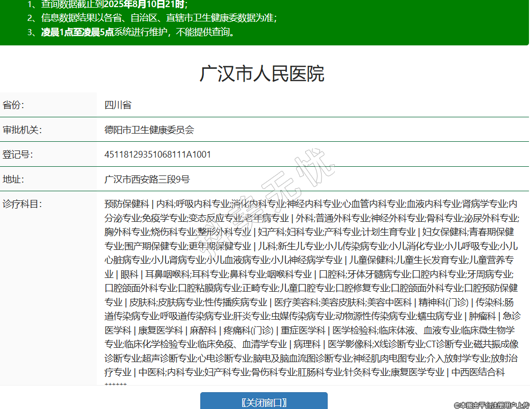 省份:四川省審批機(jī)關(guān):德陽市衛(wèi)生健康委員會登記號:45118129351068111A1001地址:廣漢市西安路三段9號診療科目:預(yù)防保健科 | 內(nèi)科;呼吸內(nèi)科專業(yè);消化內(nèi)科專業(yè);神經(jīng)內(nèi)科專業(yè);心血管內(nèi)科專業(yè);血液內(nèi)科專業(yè);腎病學(xué)專業(yè);內(nèi)分泌專業(yè);免疫學(xué)專業(yè);變態(tài)反應(yīng)專業(yè);老年病專業(yè) | 外科;普通外科專業(yè);神經(jīng)外科專業(yè);骨科專業(yè);泌尿外科專業(yè);胸外科專業(yè);燒傷科專業(yè);整形外科專業(yè) | 婦產(chǎn)科;婦科專業(yè);產(chǎn)科專業(yè);計(jì)劃生育專業(yè) | 婦女保健科;青春期保健專業(yè);圍產(chǎn)期保健專業(yè);更年期保健專業(yè) | 兒科;新生兒專業(yè);小兒傳染病專業(yè);小兒消化專業(yè);小兒呼吸專業(yè);小兒心臟病專業(yè);小兒腎病專業(yè);小兒血液病專業(yè);小兒神經(jīng)病學(xué)專業(yè) | 兒童保健科;兒童生長發(fā)育專業(yè);兒童營養(yǎng)專業(yè) | 眼科 | 耳鼻咽喉科;耳科專業(yè);鼻科專業(yè);咽喉科專業(yè) | 口腔科;牙體牙髓病專業(yè);口腔內(nèi)科專業(yè);牙周病專業(yè);口腔頜面外科專業(yè);口腔粘膜病專業(yè);正畸專業(yè);兒童口腔專業(yè);口腔修復(fù)專業(yè);口腔頜面外科專業(yè);口腔預(yù)防保健專業(yè) | 皮膚科;皮膚病專業(yè);性傳播疾病專業(yè) | 醫(yī)療美容科;美容皮膚科;美容中醫(yī)科 | 精神科(門診) | 傳染科;腸道傳染病專業(yè);呼吸道傳染病專業(yè);肝炎專業(yè);蟲媒傳染病專業(yè);動(dòng)物源性傳染病專業(yè);蠕蟲病專業(yè) | 腫瘤科 | 急診醫(yī)學(xué)科 | 康復(fù)醫(yī)學(xué)科 | 麻醉科 | 疼痛科(門診) | 重癥醫(yī)學(xué)科 | 醫(yī)學(xué)檢驗(yàn)科;臨床體液、血液專業(yè);臨床微生物學(xué)專業(yè);臨床化學(xué)檢驗(yàn)專業(yè);臨床免疫、血清學(xué)專業(yè) | 病理科 | 醫(yī)學(xué)影像科;X線診斷專業(yè);CT診斷專業(yè);磁共振成像診斷專業(yè);超聲診斷專業(yè);心電診斷專業(yè);腦電及腦血流圖診斷專業(yè);神經(jīng)肌肉電圖專業(yè);介入放射學(xué)專業(yè);放射治療專業(yè) | 中醫(yī)科;內(nèi)科專業(yè);婦產(chǎn)科專業(yè);骨傷科專業(yè);肛腸科專業(yè);針灸科專業(yè);康復(fù)醫(yī)學(xué)專業(yè) | 中西醫(yī)結(jié)合科******級別:三級法定代表人:呂波主要負(fù)責(zé)人:呂波執(zhí)業(yè)許可證有效期:2017/12/26 -至- 2032/12/25 -