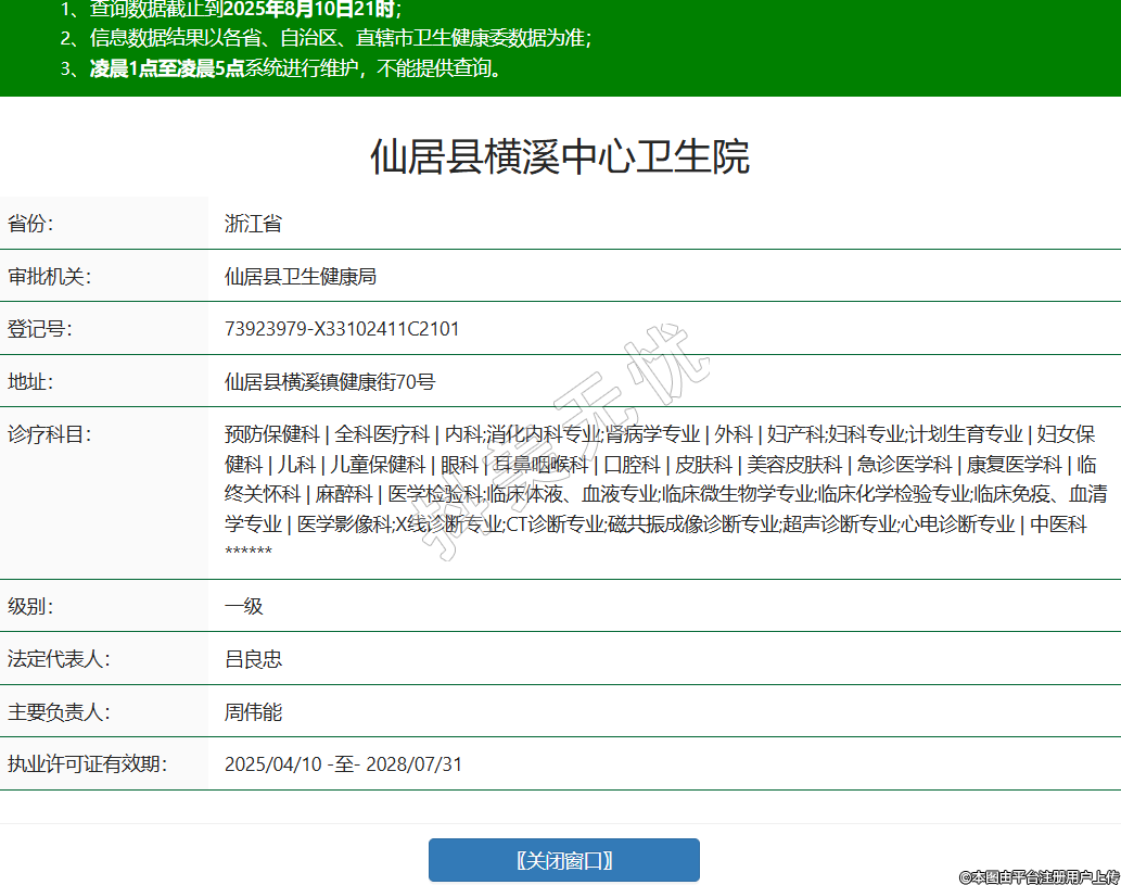 省份:浙江省審批機關:仙居縣衛(wèi)生健康局登記號:73923979-X33102411C2101地址:仙居縣橫溪鎮(zhèn)健康街70號診療科目:預防保健科 | 全科醫(yī)療科 | 內(nèi)科;消化內(nèi)科專業(yè);腎病學專業(yè) | 外科 | 婦產(chǎn)科;婦科專業(yè);計劃生育專業(yè) | 婦女保健科 | 兒科 | 兒童保健科 | 眼科 | 耳鼻咽喉科 | 口腔科 | 皮膚科 | 美容皮膚科 | 急診醫(yī)學科 | 康復醫(yī)學科 | 臨終關懷科 | 麻醉科 | 醫(yī)學檢驗科;臨床體液、血液專業(yè);臨床微生物學專業(yè);臨床化學檢驗專業(yè);臨床免疫、血清學專業(yè) | 醫(yī)學影像科;X線診斷專業(yè);CT診斷專業(yè);磁共振成像診斷專業(yè);超聲診斷專業(yè);心電診斷專業(yè) | 中醫(yī)科******級別:一級法定代表人:呂良忠主要負責人:周偉能執(zhí)業(yè)許可證有效期:2025/04/10 -至- 2028/07/31 -