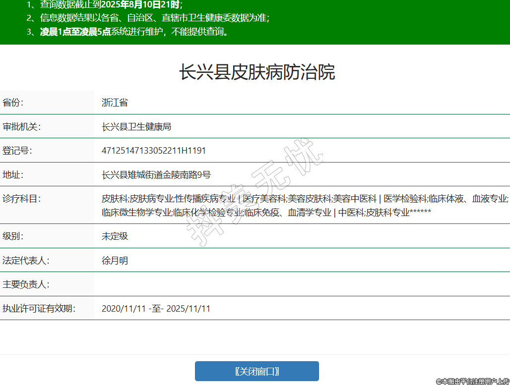 長(zhǎng)興縣皮膚病防治院,診療科目:皮膚科;皮膚病專業(yè);性傳播疾病專業(yè) | 醫(yī)療美容科;美容皮膚科;美容中醫(yī)科 | 醫(yī)學(xué)檢驗(yàn)科;臨床體液、血液專業(yè);臨床微生物學(xué)專業(yè);臨床化學(xué)檢驗(yàn)專業(yè);臨床免疫、血清學(xué)專業(yè) | 中醫(yī)科;皮膚科專業(yè)******