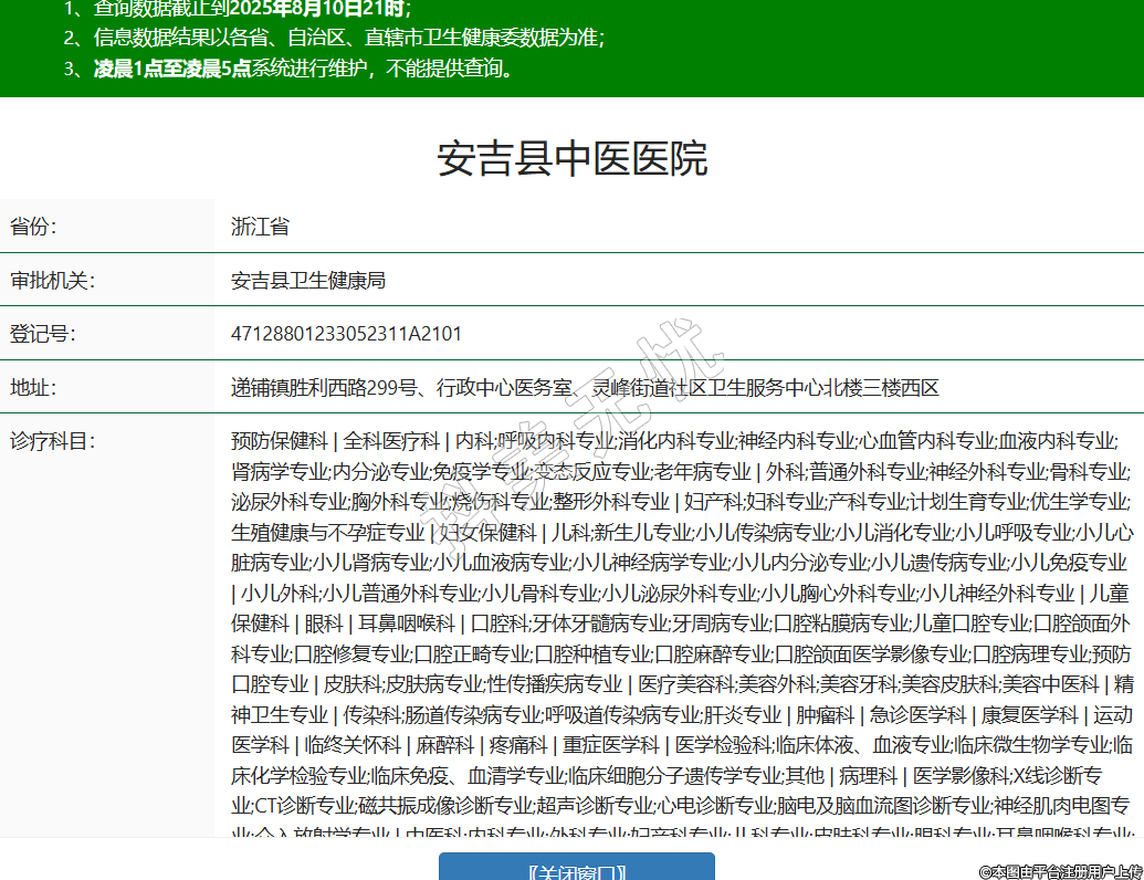 審批機(jī)關(guān):安吉縣衛(wèi)生健康局登記號(hào):47128801233052311A2101地址:遞鋪鎮(zhèn)勝利西路299號(hào)、行政中心醫(yī)務(wù)室、靈峰街道社區(qū)衛(wèi)生服務(wù)中心北樓三樓西區(qū)診療科目:預(yù)防保健科 | 全科醫(yī)療科 | 內(nèi)科;呼吸內(nèi)科專業(yè);消化內(nèi)科專業(yè);神經(jīng)內(nèi)科專業(yè);心血管內(nèi)科專業(yè);血液內(nèi)科專業(yè);腎病學(xué)專業(yè);內(nèi)分泌專業(yè);免疫學(xué)專業(yè);變態(tài)反應(yīng)專業(yè);老年病專業(yè) | 外科;普通外科專業(yè);神經(jīng)外科專業(yè);骨科專業(yè);泌尿外科專業(yè);胸外科專業(yè);燒傷科專業(yè);整形外科專業(yè) | 婦產(chǎn)科;婦科專業(yè);產(chǎn)科專業(yè);計(jì)劃生育專業(yè);優(yōu)生學(xué)專業(yè);生殖健康與不孕癥專業(yè) | 婦女保健科 | 兒科;新生兒專業(yè);小兒傳染病專業(yè);小兒消化專業(yè);小兒呼吸專業(yè);小兒心臟病專業(yè);小兒腎病專業(yè);小兒血液病專業(yè);小兒神經(jīng)病學(xué)專業(yè);小兒內(nèi)分泌專業(yè);小兒遺傳病專業(yè);小兒免疫專業(yè) | 小兒外科;小兒普通外科專業(yè);小兒骨科專業(yè);小兒泌尿外科專業(yè);小兒胸心外科專業(yè);小兒神經(jīng)外科專業(yè) | 兒童保健科 | 眼科 | 耳鼻咽喉科 | 口腔科;牙體牙髓病專業(yè);牙周病專業(yè);口腔粘膜病專業(yè);兒童口腔專業(yè);口腔頜面外科專業(yè);口腔修復(fù)專業(yè);口腔正畸專業(yè);口腔種植專業(yè);口腔麻醉專業(yè);口腔頜面醫(yī)學(xué)影像專業(yè);口腔病理專業(yè);預(yù)防口腔專業(yè) | 皮膚科;皮膚病專業(yè);性傳播疾病專業(yè) | 醫(yī)療美容科;美容外科;美容牙科;美容皮膚科;美容中醫(yī)科 | 精神衛(wèi)生專業(yè) | 傳染科;腸道傳染病專業(yè);呼吸道傳染病專業(yè);肝炎專業(yè) | 腫瘤科 | 急診醫(yī)學(xué)科 | 康復(fù)醫(yī)學(xué)科 | 運(yùn)動(dòng)醫(yī)學(xué)科 | 臨終關(guān)懷科 | 麻醉科 | 疼痛科 | 重癥醫(yī)學(xué)科 | 醫(yī)學(xué)檢驗(yàn)科;臨床體液、血液專業(yè);臨床微生物學(xué)專業(yè);臨床化學(xué)檢驗(yàn)專業(yè);臨床免疫、血清學(xué)專業(yè);臨床細(xì)胞分子遺傳學(xué)專業(yè);其他 | 病理科 | 醫(yī)學(xué)影像科;X線診斷專業(yè);CT診斷專業(yè);磁共振成像診斷專業(yè);超聲診斷專業(yè);心電診斷專業(yè);腦電及腦血流圖診斷專業(yè);神經(jīng)肌肉電圖專業(yè);介入放射學(xué)專業(yè) | 中醫(yī)科;內(nèi)科專業(yè);外科專業(yè);婦產(chǎn)科專業(yè);兒科專業(yè);皮膚科專業(yè);眼科專業(yè);耳鼻咽喉科專業(yè);口腔科專業(yè);腫瘤科專業(yè);骨傷科專業(yè);肛腸科專業(yè);老年病科專業(yè);針灸科專業(yè);推拿科專業(yè);康復(fù)醫(yī)學(xué)專業(yè);急診科專業(yè);預(yù)防保健科專業(yè) | 中西醫(yī)結(jié)合科******級(jí)別:三級(jí)法定代表人:程艷主要負(fù)責(zé)人:程艷執(zhí)業(yè)許可證有效期:2025/04/22 -至- 2035/04/01 -
