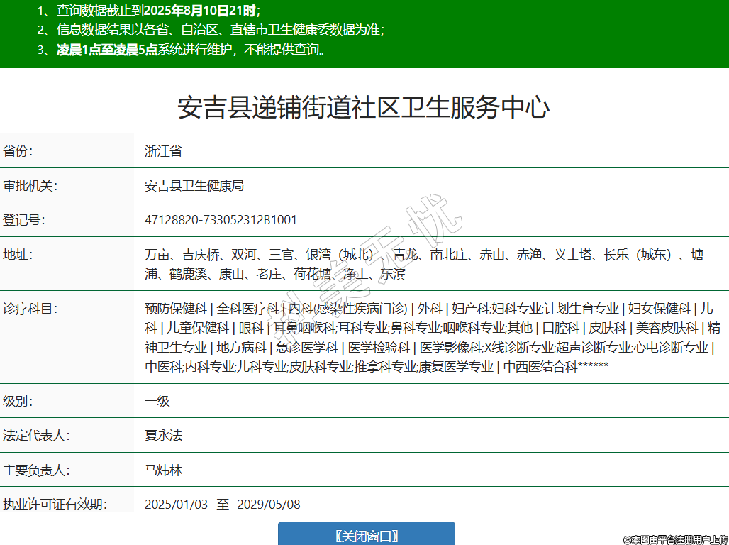 省份:浙江省審批機(jī)關(guān):安吉縣衛(wèi)生健康局登記號:47128820-733052312B1001地址:萬畝、吉慶橋、雙河、三官、銀灣(城北)、青龍、南北莊、赤山、赤漁、義士塔、長樂(城東)、塘浦、鶴鹿溪、康山、老莊、荷花塘、凈土、東濱診療科目:預(yù)防保健科 | 全科醫(yī)療科 | 內(nèi)科(感染性疾病門診) | 外科 | 婦產(chǎn)科;婦科專業(yè);計劃生育專業(yè) | 婦女保健科 | 兒科 | 兒童保健科 | 眼科 | 耳鼻咽喉科;耳科專業(yè);鼻科專業(yè);咽喉科專業(yè);其他 | 口腔科 | 皮膚科 | 美容皮膚科 | 精神衛(wèi)生專業(yè) | 地方病科 | 急診醫(yī)學(xué)科 | 醫(yī)學(xué)檢驗科 | 醫(yī)學(xué)影像科;X線診斷專業(yè);超聲診斷專業(yè);心電診斷專業(yè) | 中醫(yī)科;內(nèi)科專業(yè);兒科專業(yè);皮膚科專業(yè);推拿科專業(yè);康復(fù)醫(yī)學(xué)專業(yè) | 中西醫(yī)結(jié)合科******級別:一級法定代表人:夏永法主要負(fù)責(zé)人:馬煒林執(zhí)業(yè)許可證有效期:2025/01/03 -至- 2029/05/08 -