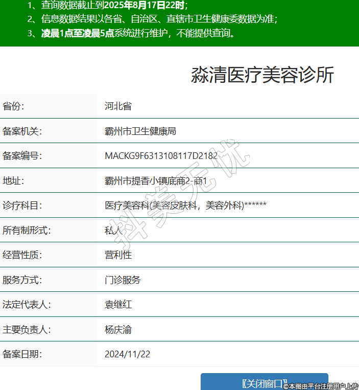 省份:河北省備案機(jī)關(guān):霸州市衛(wèi)生健康局備案編號(hào):MACKG9F6313108117D2182地址:霸州市提香小鎮(zhèn)底商2-商1診療科目:醫(yī)療美容科(美容皮膚科,美容外科)******所有制形式:私人經(jīng)營(yíng)性質(zhì):營(yíng)利性服務(wù)方式:門診服務(wù)法定代表人:袁繼紅主要負(fù)責(zé)人:楊慶渝備案日期:2024/11/22 -