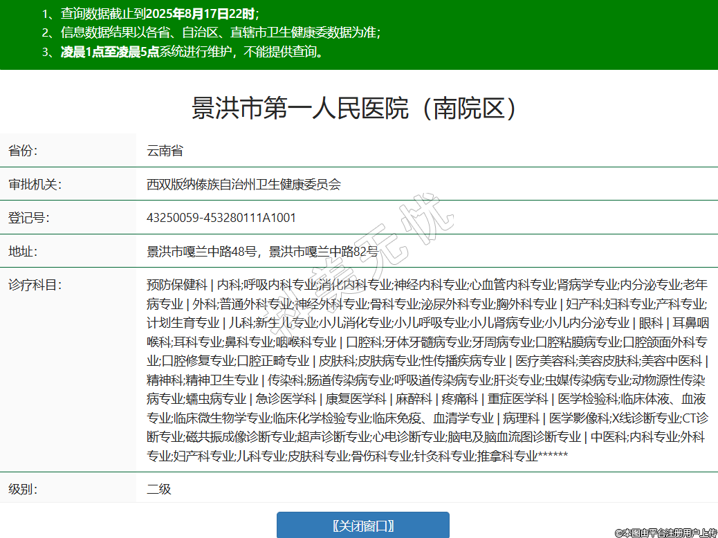 省份:云南省審批機(jī)關(guān):西雙版納傣族自治州衛(wèi)生健康委員會(huì)登記號(hào):43250059-453280111A1001地址:景洪市嘎蘭中路48號(hào),景洪市嘎蘭中路82號(hào)診療科目:預(yù)防保健科 | 內(nèi)科;呼吸內(nèi)科專業(yè);消化內(nèi)科專業(yè);神經(jīng)內(nèi)科專業(yè);心血管內(nèi)科專業(yè);腎病學(xué)專業(yè);內(nèi)分泌專業(yè);老年病專業(yè) | 外科;普通外科專業(yè);神經(jīng)外科專業(yè);骨科專業(yè);泌尿外科專業(yè);胸外科專業(yè) | 婦產(chǎn)科;婦科專業(yè);產(chǎn)科專業(yè);計(jì)劃生育專業(yè) | 兒科;新生兒專業(yè);小兒消化專業(yè);小兒呼吸專業(yè);小兒腎病專業(yè);小兒內(nèi)分泌專業(yè) | 眼科 | 耳鼻咽喉科;耳科專業(yè);鼻科專業(yè);咽喉科專業(yè) | 口腔科;牙體牙髓病專業(yè);牙周病專業(yè);口腔粘膜病專業(yè);口腔頜面外科專業(yè);口腔修復(fù)專業(yè);口腔正畸專業(yè) | 皮膚科;皮膚病專業(yè);性傳播疾病專業(yè) | 醫(yī)療美容科;美容皮膚科;美容中醫(yī)科 | 精神科;精神衛(wèi)生專業(yè) | 傳染科;腸道傳染病專業(yè);呼吸道傳染病專業(yè);肝炎專業(yè);蟲(chóng)媒傳染病專業(yè);動(dòng)物源性傳染病專業(yè);蠕蟲(chóng)病專業(yè) | 急診醫(yī)學(xué)科 | 康復(fù)醫(yī)學(xué)科 | 麻醉科 | 疼痛科 | 重癥醫(yī)學(xué)科 | 醫(yī)學(xué)檢驗(yàn)科;臨床體液、血液專業(yè);臨床微生物學(xué)專業(yè);臨床化學(xué)檢驗(yàn)專業(yè);臨床免疫、血清學(xué)專業(yè) | 病理科 | 醫(yī)學(xué)影像科;X線診斷專業(yè);CT診斷專業(yè);磁共振成像診斷專業(yè);超聲診斷專業(yè);心電診斷專業(yè);腦電及腦血流圖診斷專業(yè) | 中醫(yī)科;內(nèi)科專業(yè);外科專業(yè);婦產(chǎn)科專業(yè);兒科專業(yè);皮膚科專業(yè);骨傷科專業(yè);針灸科專業(yè);推拿科專業(yè)******級(jí)別:二級(jí)法定代表人:段世澤主要負(fù)責(zé)人:段家鏡執(zhí)業(yè)許可證有效期:2024/08/29 -至- 2038/09/18 -