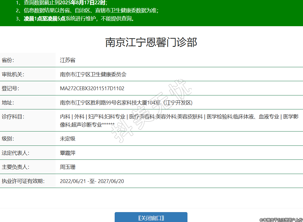 省份:江蘇省審批機關:南京市江寧區(qū)衛(wèi)生健康委員會登記號:MA272CEBX32011517D1102地址:南京市江寧區(qū)勝利路99號名家科技大廈104室(江寧開發(fā)區(qū))診療科目:內科 | 外科 | 婦產(chǎn)科;婦科專業(yè) | 醫(yī)療美容科;美容外科;美容皮膚科 | 醫(yī)學檢驗科;臨床體液、血液專業(yè) | 醫(yī)學影像科;超聲診斷專業(yè)******級別:未定級法定代表人:覃霞萍主要負責人:周玉珊執(zhí)業(yè)許可證有效期:2022/06/21 -至- 2027/06/20 -