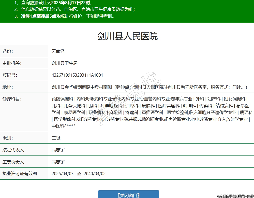 省份:云南省審批機(jī)關(guān):劍川縣衛(wèi)生局登記號(hào):43267199153293111A1001地址:劍川縣金華鎮(zhèn)劍鶴路中登村南側(cè)(延伸點(diǎn):劍川縣人民醫(yī)院駐劍川縣看守所醫(yī)務(wù)室,服務(wù)方式:門診。)診療科目:預(yù)防保健科 | 內(nèi)科;呼吸內(nèi)科專業(yè);消化內(nèi)科專業(yè);心血管內(nèi)科專業(yè);老年病專業(yè) | 外科 | 婦產(chǎn)科 | 婦女保健科 | 兒科 | 兒童保健科 | 眼科 | 耳鼻咽喉科 | 口腔科 | 皮膚科 | 醫(yī)療美容科 | 精神科 | 傳染科 | 結(jié)核病科 | 急診醫(yī)學(xué)科 | 康復(fù)醫(yī)學(xué)科 | 職業(yè)病科 | 麻醉科 | 疼痛科 | 重癥醫(yī)學(xué)科 | 醫(yī)學(xué)檢驗(yàn)科;臨床細(xì)胞分子遺傳學(xué)專業(yè) | 病理科 | 醫(yī)學(xué)影像科;X線診斷專業(yè);CT診斷專業(yè);磁共振成像診斷專業(yè);超聲診斷專業(yè);心電診斷專業(yè);介入放射學(xué)專業(yè) | 中醫(yī)科******級(jí)別:二級(jí)法定代表人:高志宇主要負(fù)責(zé)人:高志宇執(zhí)業(yè)許可證有效期:2025/04/03 -至- 2040/04/02 -