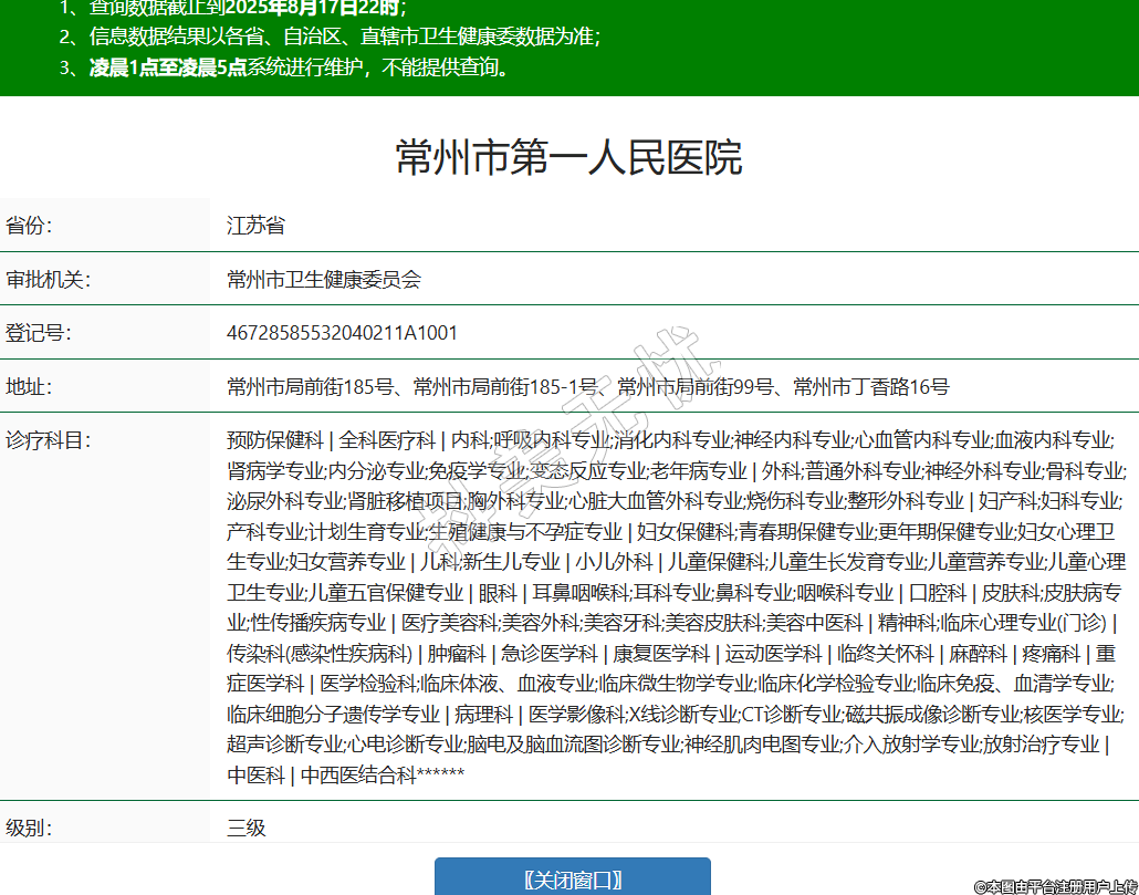 省份:江蘇省審批機(jī)關(guān):常州市衛(wèi)生健康委員會(huì)登記號(hào):46728585532040211A1001地址:常州市局前街185號(hào)、常州市局前街185-1號(hào)、常州市局前街99號(hào)、常州市丁香路16號(hào)診療科目:預(yù)防保健科 | 全科醫(yī)療科 | 內(nèi)科;呼吸內(nèi)科專業(yè);消化內(nèi)科專業(yè);神經(jīng)內(nèi)科專業(yè);心血管內(nèi)科專業(yè);血液內(nèi)科專業(yè);腎病學(xué)專業(yè);內(nèi)分泌專業(yè);免疫學(xué)專業(yè);變態(tài)反應(yīng)專業(yè);老年病專業(yè) | 外科;普通外科專業(yè);神經(jīng)外科專業(yè);骨科專業(yè);泌尿外科專業(yè);腎臟移植項(xiàng)目;胸外科專業(yè);心臟大血管外科專業(yè);燒傷科專業(yè);整形外科專業(yè) | 婦產(chǎn)科;婦科專業(yè);產(chǎn)科專業(yè);計(jì)劃生育專業(yè);生殖健康與不孕癥專業(yè) | 婦女保健科;青春期保健專業(yè);更年期保健專業(yè);婦女心理衛(wèi)生專業(yè);婦女營養(yǎng)專業(yè) | 兒科;新生兒專業(yè) | 小兒外科 | 兒童保健科;兒童生長發(fā)育專業(yè);兒童營養(yǎng)專業(yè);兒童心理衛(wèi)生專業(yè);兒童五官保健專業(yè) | 眼科 | 耳鼻咽喉科;耳科專業(yè);鼻科專業(yè);咽喉科專業(yè) | 口腔科 | 皮膚科;皮膚病專業(yè);性傳播疾病專業(yè) | 醫(yī)療美容科;美容外科;美容牙科;美容皮膚科;美容中醫(yī)科 | 精神科;臨床心理專業(yè)(門診) | 傳染科(感染性疾病科) | 腫瘤科 | 急診醫(yī)學(xué)科 | 康復(fù)醫(yī)學(xué)科 | 運(yùn)動(dòng)醫(yī)學(xué)科 | 臨終關(guān)懷科 | 麻醉科 | 疼痛科 | 重癥醫(yī)學(xué)科 | 醫(yī)學(xué)檢驗(yàn)科;臨床體液、血液專業(yè);臨床微生物學(xué)專業(yè);臨床化學(xué)檢驗(yàn)專業(yè);臨床免疫、血清學(xué)專業(yè);臨床細(xì)胞分子遺傳學(xué)專業(yè) | 病理科 | 醫(yī)學(xué)影像科;X線診斷專業(yè);CT診斷專業(yè);磁共振成像診斷專業(yè);核醫(yī)學(xué)專業(yè);超聲診斷專業(yè);心電診斷專業(yè);腦電及腦血流圖診斷專業(yè);神經(jīng)肌肉電圖專業(yè);介入放射學(xué)專業(yè);放射治療專業(yè) | 中醫(yī)科 | 中西醫(yī)結(jié)合科******級(jí)別:三級(jí)法定代表人:周軍主要負(fù)責(zé)人:周軍執(zhí)業(yè)許可證有效期:2024/09/11 -至- 2035/01/17 -