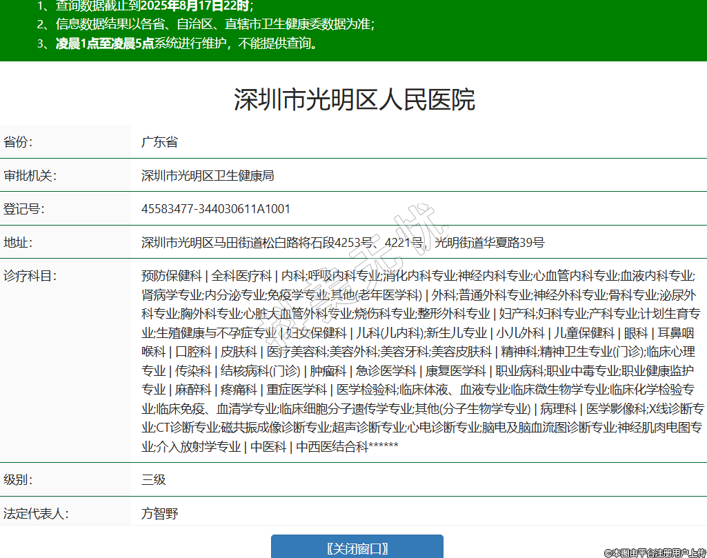 省份:廣東省審批機關:深圳市光明區(qū)衛(wèi)生健康局登記號:45583477-344030611A1001地址:深圳市光明區(qū)馬田街道松白路將石段4253號、4221號,光明街道華夏路39號診療科目:預防保健科 | 全科醫(yī)療科 | 內科;呼吸內科專業(yè);消化內科專業(yè);神經內科專業(yè);心血管內科專業(yè);血液內科專業(yè);腎病學專業(yè);內分泌專業(yè);免疫學專業(yè);其他(老年醫(yī)學科) | 外科;普通外科專業(yè);神經外科專業(yè);骨科專業(yè);泌尿外科專業(yè);胸外科專業(yè);心臟大血管外科專業(yè);燒傷科專業(yè);整形外科專業(yè) | 婦產科;婦科專業(yè);產科專業(yè);計劃生育專業(yè);生殖健康與不孕癥專業(yè) | 婦女保健科 | 兒科(兒內科);新生兒專業(yè) | 小兒外科 | 兒童保健科 | 眼科 | 耳鼻咽喉科 | 口腔科 | 皮膚科 | 醫(yī)療美容科;美容外科;美容牙科;美容皮膚科 | 精神科;精神衛(wèi)生專業(yè)(門診);臨床心理專業(yè) | 傳染科 | 結核病科(門診) | 腫瘤科 | 急診醫(yī)學科 | 康復醫(yī)學科 | 職業(yè)病科;職業(yè)中毒專業(yè);職業(yè)健康監(jiān)護專業(yè) | 麻醉科 | 疼痛科 | 重癥醫(yī)學科 | 醫(yī)學檢驗科;臨床體液、血液專業(yè);臨床微生物學專業(yè);臨床化學檢驗專業(yè);臨床免疫、血清學專業(yè);臨床細胞分子遺傳學專業(yè);其他(分子生物學專業(yè)) | 病理科 | 醫(yī)學影像科;X線診斷專業(yè);CT診斷專業(yè);磁共振成像診斷專業(yè);超聲診斷專業(yè);心電診斷專業(yè);腦電及腦血流圖診斷專業(yè);神經肌肉電圖專業(yè);介入放射學專業(yè) | 中醫(yī)科 | 中西醫(yī)結合科******級別:三級法定代表人:方智野主要負責人:***執(zhí)業(yè)許可證有效期:2021/09/10 -至- 2036/09/09 -