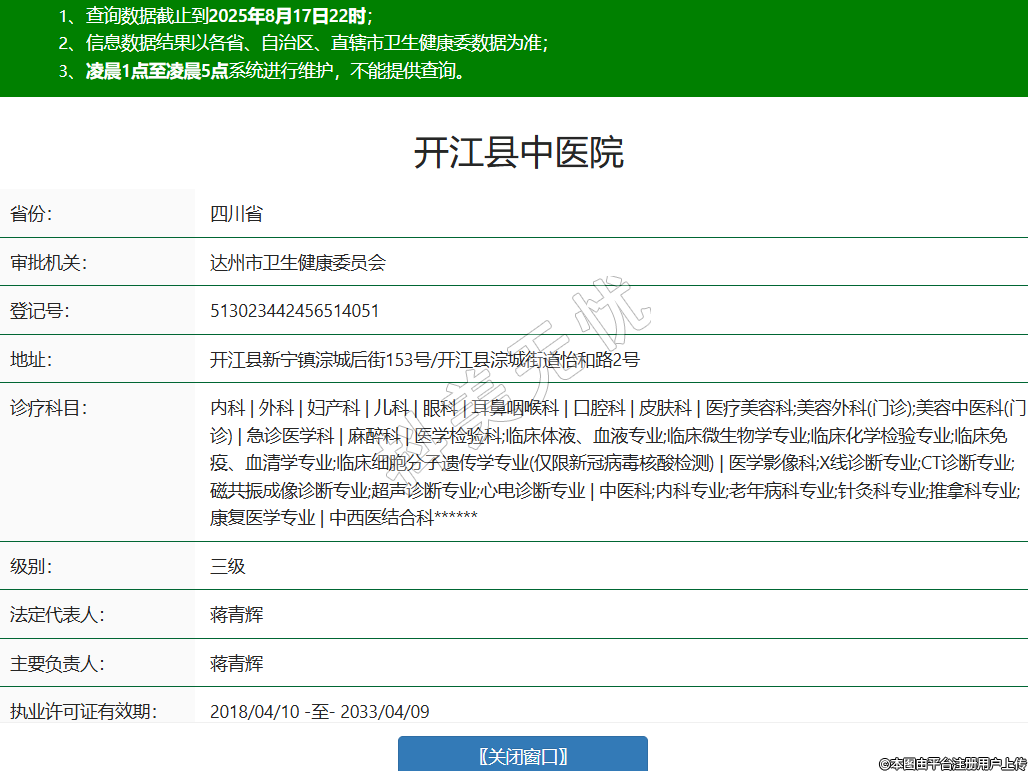 省份:四川省審批機(jī)關(guān):達(dá)州市衛(wèi)生健康委員會登記號:513023442456514051地址:開江縣新寧鎮(zhèn)淙城后街153號/開江縣淙城街道怡和路2號診療科目:內(nèi)科 | 外科 | 婦產(chǎn)科 | 兒科 | 眼科 | 耳鼻咽喉科 | 口腔科 | 皮膚科 | 醫(yī)療美容科;美容外科(門診);美容中醫(yī)科(門診) | 急診醫(yī)學(xué)科 | 麻醉科 | 醫(yī)學(xué)檢驗(yàn)科;臨床體液、血液專業(yè);臨床微生物學(xué)專業(yè);臨床化學(xué)檢驗(yàn)專業(yè);臨床免疫、血清學(xué)專業(yè);臨床細(xì)胞分子遺傳學(xué)專業(yè)(僅限新冠病毒核酸檢測) | 醫(yī)學(xué)影像科;X線診斷專業(yè);CT診斷專業(yè);磁共振成像診斷專業(yè);超聲診斷專業(yè);心電診斷專業(yè) | 中醫(yī)科;內(nèi)科專業(yè);老年病科專業(yè);針灸科專業(yè);推拿科專業(yè);康復(fù)醫(yī)學(xué)專業(yè) | 中西醫(yī)結(jié)合科******級別:三級法定代表人:蔣青輝主要負(fù)責(zé)人:蔣青輝執(zhí)業(yè)許可證有效期:2018/04/10 -至- 2033/04/09 -