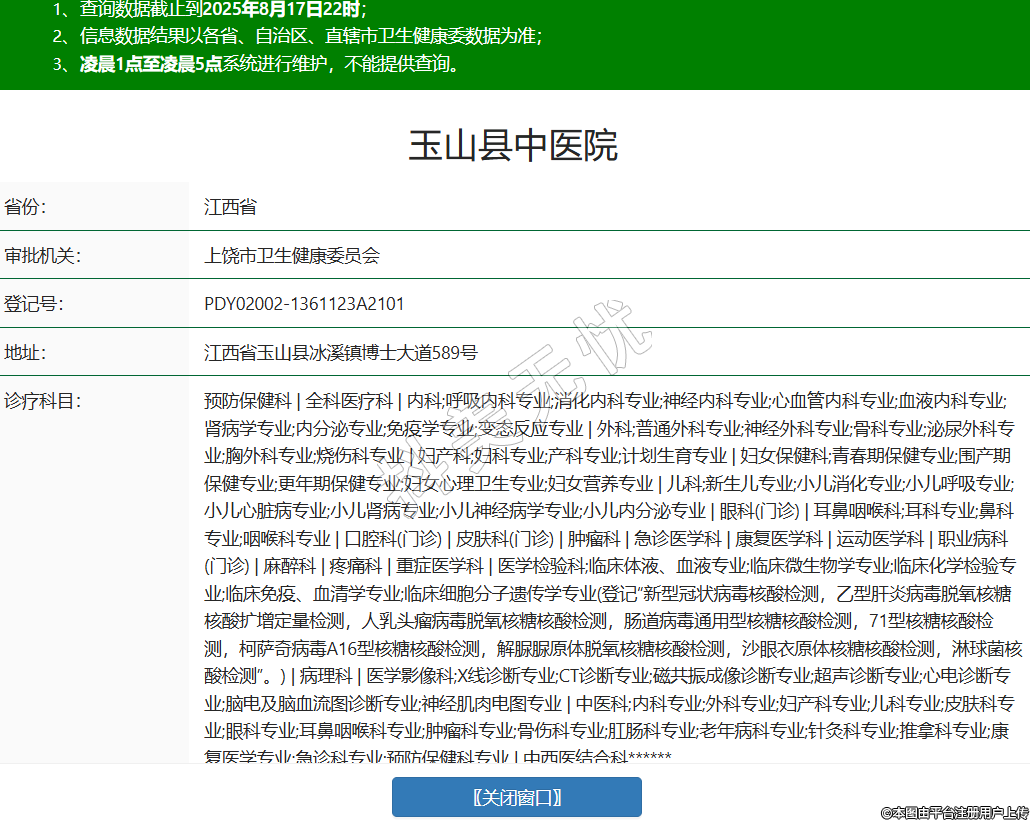 省份:江西省審批機(jī)關(guān):上饒市衛(wèi)生健康委員會登記號:PDY02002-1361123A2101地址:江西省玉山縣冰溪鎮(zhèn)博士大道589號診療科目:預(yù)防保健科 | 全科醫(yī)療科 | 內(nèi)科;呼吸內(nèi)科專業(yè);消化內(nèi)科專業(yè);神經(jīng)內(nèi)科專業(yè);心血管內(nèi)科專業(yè);血液內(nèi)科專業(yè);腎病學(xué)專業(yè);內(nèi)分泌專業(yè);免疫學(xué)專業(yè);變態(tài)反應(yīng)專業(yè) | 外科;普通外科專業(yè);神經(jīng)外科專業(yè);骨科專業(yè);泌尿外科專業(yè);胸外科專業(yè);燒傷科專業(yè) | 婦產(chǎn)科;婦科專業(yè);產(chǎn)科專業(yè);計劃生育專業(yè) | 婦女保健科;青春期保健專業(yè);圍產(chǎn)期保健專業(yè);更年期保健專業(yè);婦女心理衛(wèi)生專業(yè);婦女營養(yǎng)專業(yè) | 兒科;新生兒專業(yè);小兒消化專業(yè);小兒呼吸專業(yè);小兒心臟病專業(yè);小兒腎病專業(yè);小兒神經(jīng)病學(xué)專業(yè);小兒內(nèi)分泌專業(yè) | 眼科(門診) | 耳鼻咽喉科;耳科專業(yè);鼻科專業(yè);咽喉科專業(yè) | 口腔科(門診) | 皮膚科(門診) | 腫瘤科 | 急診醫(yī)學(xué)科 | 康復(fù)醫(yī)學(xué)科 | 運(yùn)動醫(yī)學(xué)科 | 職業(yè)病科(門診) | 麻醉科 | 疼痛科 | 重癥醫(yī)學(xué)科 | 醫(yī)學(xué)檢驗(yàn)科;臨床體液、血液專業(yè);臨床微生物學(xué)專業(yè);臨床化學(xué)檢驗(yàn)專業(yè);臨床免疫、血清學(xué)專業(yè);臨床細(xì)胞分子遺傳學(xué)專業(yè)(登記“新型冠狀病毒核酸檢測,乙型肝炎病毒脫氧核糖核酸擴(kuò)增定量檢測,人乳頭瘤病毒脫氧核糖核酸檢測,腸道病毒通用型核糖核酸檢測,71型核糖核酸檢測,柯薩奇病毒A16型核糖核酸檢測,解脲脲原體脫氧核糖核酸檢測,沙眼衣原體核糖核酸檢測,淋球菌核酸檢測”。) | 病理科 | 醫(yī)學(xué)影像科;X線診斷專業(yè);CT診斷專業(yè);磁共振成像診斷專業(yè);超聲診斷專業(yè);心電診斷專業(yè);腦電及腦血流圖診斷專業(yè);神經(jīng)肌肉電圖專業(yè) | 中醫(yī)科;內(nèi)科專業(yè);外科專業(yè);婦產(chǎn)科專業(yè);兒科專業(yè);皮膚科專業(yè);眼科專業(yè);耳鼻咽喉科專業(yè);腫瘤科專業(yè);骨傷科專業(yè);肛腸科專業(yè);老年病科專業(yè);針灸科專業(yè);推拿科專業(yè);康復(fù)醫(yī)學(xué)專業(yè);急診科專業(yè);預(yù)防保健科專業(yè) | 中西醫(yī)結(jié)合科******級別:三級法定代表人:顧曉軍主要負(fù)責(zé)人:鄭防軍執(zhí)業(yè)許可證有效期:2021/02/24 -至- 2036/02/23 -