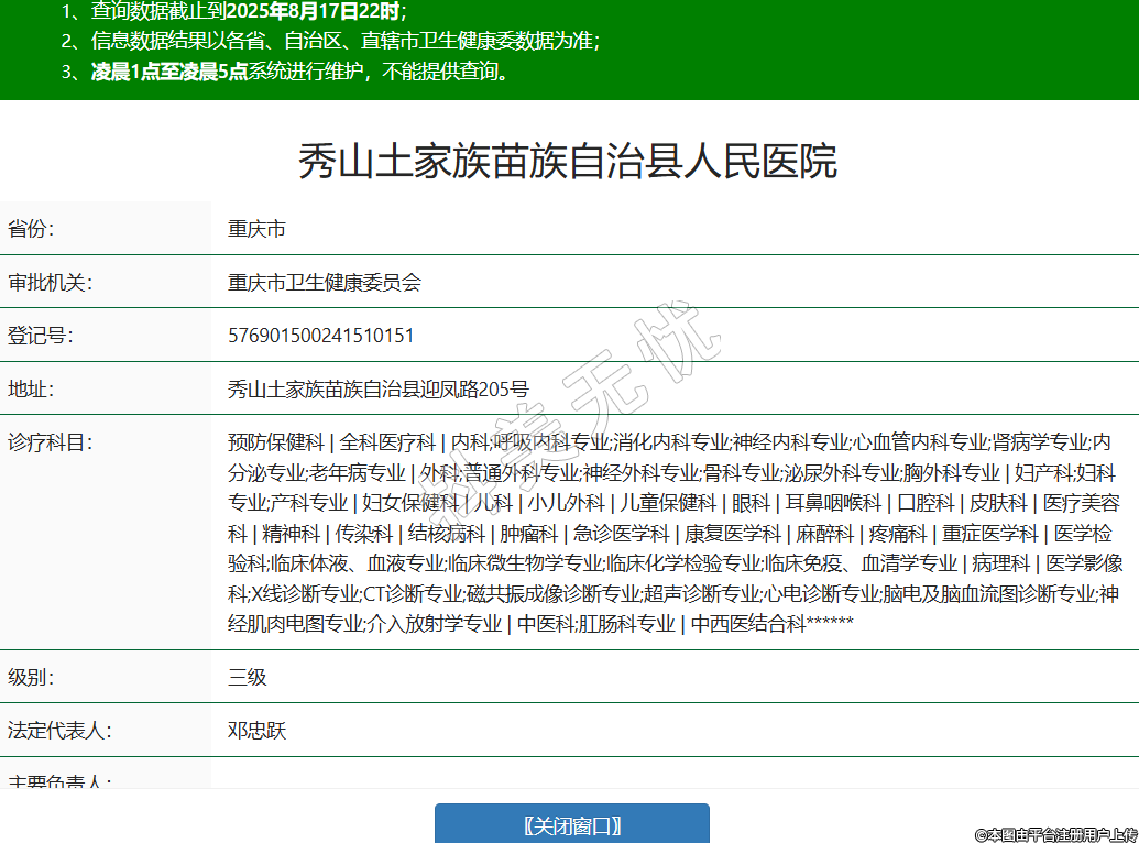 省份:重慶市審批機(jī)關(guān):重慶市衛(wèi)生健康委員會(huì)登記號(hào):576901500241510151地址:秀山土家族苗族自治縣迎鳳路205號(hào)診療科目:預(yù)防保健科 | 全科醫(yī)療科 | 內(nèi)科;呼吸內(nèi)科專業(yè);消化內(nèi)科專業(yè);神經(jīng)內(nèi)科專業(yè);心血管內(nèi)科專業(yè);腎病學(xué)專業(yè);內(nèi)分泌專業(yè);老年病專業(yè) | 外科;普通外科專業(yè);神經(jīng)外科專業(yè);骨科專業(yè);泌尿外科專業(yè);胸外科專業(yè) | 婦產(chǎn)科;婦科專業(yè);產(chǎn)科專業(yè) | 婦女保健科 | 兒科 | 小兒外科 | 兒童保健科 | 眼科 | 耳鼻咽喉科 | 口腔科 | 皮膚科 | 醫(yī)療美容科 | 精神科 | 傳染科 | 結(jié)核病科 | 腫瘤科 | 急診醫(yī)學(xué)科 | 康復(fù)醫(yī)學(xué)科 | 麻醉科 | 疼痛科 | 重癥醫(yī)學(xué)科 | 醫(yī)學(xué)檢驗(yàn)科;臨床體液、血液專業(yè);臨床微生物學(xué)專業(yè);臨床化學(xué)檢驗(yàn)專業(yè);臨床免疫、血清學(xué)專業(yè) | 病理科 | 醫(yī)學(xué)影像科;X線診斷專業(yè);CT診斷專業(yè);磁共振成像診斷專業(yè);超聲診斷專業(yè);心電診斷專業(yè);腦電及腦血流圖診斷專業(yè);神經(jīng)肌肉電圖專業(yè);介入放射學(xué)專業(yè) | 中醫(yī)科;肛腸科專業(yè) | 中西醫(yī)結(jié)合科******級(jí)別:三級(jí)法定代表人:鄧忠躍主要負(fù)責(zé)人:執(zhí)業(yè)許可證有效期:2016/08/30 -至- 2031/08/29 -