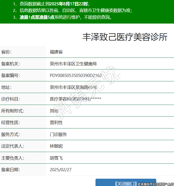 省份:福建省備案機(jī)關(guān):泉州市豐澤區(qū)衛(wèi)生健康局備案編號(hào):PDY00850535050390D2162地址:泉州市豐澤區(qū)泉海路69號(hào)診療科目:醫(yī)療美容科(美容外科)******所有制形式:其他經(jīng)營(yíng)性質(zhì):營(yíng)利性服務(wù)方式:門(mén)診服務(wù)法定代表人:林敏妮主要負(fù)責(zé)人:胡雪飛備案日期:2025/02/27 -