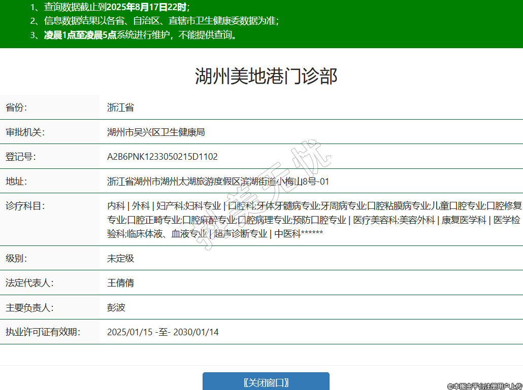 省份:浙江省審批機(jī)關(guān):湖州市吳興區(qū)衛(wèi)生健康局登記號:A2B6PNK1233050215D1102地址:浙江省湖州市湖州太湖旅游度假區(qū)濱湖街道小梅山8號-01診療科目:內(nèi)科 | 外科 | 婦產(chǎn)科;婦科專業(yè) | 口腔科;牙體牙髓病專業(yè);牙周病專業(yè);口腔粘膜病專業(yè);兒童口腔專業(yè);口腔修復(fù)專業(yè);口腔正畸專業(yè);口腔麻醉專業(yè);口腔病理專業(yè);預(yù)防口腔專業(yè) | 醫(yī)療美容科;美容外科 | 康復(fù)醫(yī)學(xué)科 | 醫(yī)學(xué)檢驗(yàn)科;臨床體液、血液專業(yè) | 超聲診斷專業(yè) | 中醫(yī)科******級別:未定級法定代表人:王倩倩主要負(fù)責(zé)人:彭波執(zhí)業(yè)許可證有效期:2025/01/15 -至- 2030/01/14 -