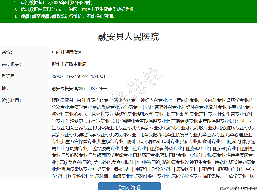 省份:廣西壯族自治區(qū)審批機(jī)關(guān):柳州市行政審批局登記號(hào):49907833-245022411A1001地址:融安縣長(zhǎng)安鎮(zhèn)新民一區(qū)324號(hào)診療科目:預(yù)防保健科 | 內(nèi)科;呼吸內(nèi)科專(zhuān)業(yè);消化內(nèi)科專(zhuān)業(yè);神經(jīng)內(nèi)科專(zhuān)業(yè);心血管內(nèi)科專(zhuān)業(yè);血液內(nèi)科專(zhuān)業(yè);腎病學(xué)專(zhuān)業(yè);內(nèi)分泌專(zhuān)業(yè);免疫學(xué)專(zhuān)業(yè);變態(tài)反應(yīng)專(zhuān)業(yè);老年病專(zhuān)業(yè) | 外科;普通外科專(zhuān)業(yè);神經(jīng)外科專(zhuān)業(yè);骨科專(zhuān)業(yè);泌尿外科專(zhuān)業(yè);胸外科專(zhuān)業(yè);心臟大血管外科專(zhuān)業(yè);燒傷科專(zhuān)業(yè);整形外科專(zhuān)業(yè) | 婦產(chǎn)科;婦科專(zhuān)業(yè);產(chǎn)科專(zhuān)業(yè);計(jì)劃生育專(zhuān)業(yè);優(yōu)生學(xué)專(zhuān)業(yè);生殖健康與不孕癥專(zhuān)業(yè) | 婦女保健科;青春期保健專(zhuān)業(yè);圍產(chǎn)期保健專(zhuān)業(yè);更年期保健專(zhuān)業(yè);婦女心理衛(wèi)生專(zhuān)業(yè);婦女營(yíng)養(yǎng)專(zhuān)業(yè) | 兒科;新生兒專(zhuān)業(yè);小兒傳染病專(zhuān)業(yè);小兒消化專(zhuān)業(yè);小兒呼吸專(zhuān)業(yè);小兒心臟病專(zhuān)業(yè);小兒腎病專(zhuān)業(yè);小兒神經(jīng)病學(xué)專(zhuān)業(yè);小兒內(nèi)分泌專(zhuān)業(yè) | 兒童保健科;兒童生長(zhǎng)發(fā)育專(zhuān)業(yè);兒童營(yíng)養(yǎng)專(zhuān)業(yè);兒童心理衛(wèi)生專(zhuān)業(yè);兒童五官保健專(zhuān)業(yè);兒童康復(fù)專(zhuān)業(yè) | 眼科 | 耳鼻咽喉科;耳科專(zhuān)業(yè);鼻科專(zhuān)業(yè);咽喉科專(zhuān)業(yè) | 口腔科;牙體牙髓病專(zhuān)業(yè);牙周病專(zhuān)業(yè);口腔粘膜病專(zhuān)業(yè);兒童口腔專(zhuān)業(yè);口腔頜面外科專(zhuān)業(yè);口腔修復(fù)專(zhuān)業(yè);口腔正畸專(zhuān)業(yè);口腔種植專(zhuān)業(yè);口腔麻醉專(zhuān)業(yè);口腔頜面醫(yī)學(xué)影像專(zhuān)業(yè);口腔病理專(zhuān)業(yè);預(yù)防口腔專(zhuān)業(yè) | 皮膚科;皮膚病專(zhuān)業(yè);性傳播疾病專(zhuān)業(yè) | 醫(yī)療美容科(門(mén)診);美容外科;美容皮膚科 | 精神科(門(mén)診);精神病專(zhuān)業(yè);精神衛(wèi)生專(zhuān)業(yè) | 傳染科;腸道傳染病專(zhuān)業(yè);呼吸道傳染病專(zhuān)業(yè);肝炎專(zhuān)業(yè) | 結(jié)核病科 | 腫瘤科 | 急診醫(yī)學(xué)科 | 康復(fù)醫(yī)學(xué)科 | 麻醉科 | 疼痛科(門(mén)診) | 重癥醫(yī)學(xué)科 | 醫(yī)學(xué)檢驗(yàn)科;臨床體液、血液專(zhuān)業(yè);臨床微生物學(xué)專(zhuān)業(yè);臨床化學(xué)檢驗(yàn)專(zhuān)業(yè);臨床免疫、血清學(xué)專(zhuān)業(yè) | 病理科 | 醫(yī)學(xué)影像科;X線診斷專(zhuān)業(yè);CT診斷專(zhuān)業(yè);磁共振成像診斷專(zhuān)業(yè);超聲診斷專(zhuān)業(yè);心電診斷專(zhuān)業(yè);腦電及腦血流圖診斷專(zhuān)業(yè);介入放射學(xué)專(zhuān)業(yè) | 中醫(yī)科;內(nèi)科專(zhuān)業(yè);外科專(zhuān)業(yè);婦產(chǎn)科專(zhuān)業(yè);兒科專(zhuān)業(yè);骨傷科專(zhuān)業(yè);肛腸科專(zhuān)業(yè);老年病科專(zhuān)業(yè);針灸科專(zhuān)業(yè);推拿科專(zhuān)業(yè);康復(fù)醫(yī)學(xué)專(zhuān)業(yè) | 中西醫(yī)結(jié)合科******級(jí)別:二級(jí)法定代表人:劉朝暉主要負(fù)責(zé)人:劉朝暉執(zhí)業(yè)許可證有效期:2025/07/28 -至- 2033/07/31 -