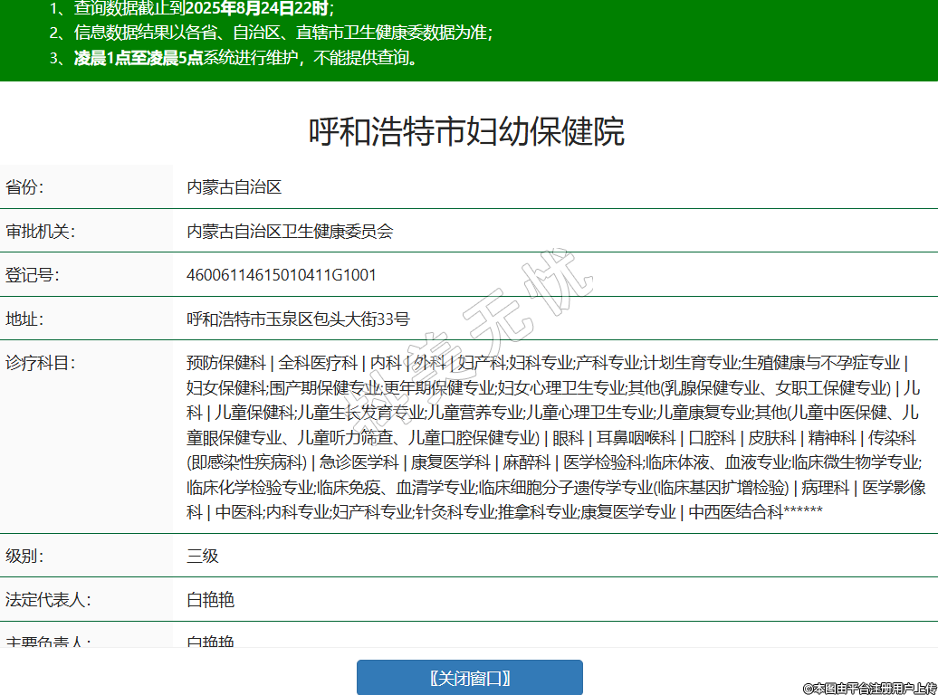 省份:內(nèi)蒙古自治區(qū)審批機關(guān):內(nèi)蒙古自治區(qū)衛(wèi)生健康委員會登記號:46006114615010411G1001地址:呼和浩特市玉泉區(qū)包頭大街33號診療科目:預(yù)防保健科 | 全科醫(yī)療科 | 內(nèi)科 | 外科 | 婦產(chǎn)科;婦科專業(yè);產(chǎn)科專業(yè);計劃生育專業(yè);生殖健康與不孕癥專業(yè) | 婦女保健科;圍產(chǎn)期保健專業(yè);更年期保健專業(yè);婦女心理衛(wèi)生專業(yè);其他(乳腺保健專業(yè)、女職工保健專業(yè)) | 兒科 | 兒童保健科;兒童生長發(fā)育專業(yè);兒童營養(yǎng)專業(yè);兒童心理衛(wèi)生專業(yè);兒童康復(fù)專業(yè);其他(兒童中醫(yī)保健、兒童眼保健專業(yè)、兒童聽力篩查、兒童口腔保健專業(yè)) | 眼科 | 耳鼻咽喉科 | 口腔科 | 皮膚科 | 精神科 | 傳染科(即感染性疾病科) | 急診醫(yī)學科 | 康復(fù)醫(yī)學科 | 麻醉科 | 醫(yī)學檢驗科;臨床體液、血液專業(yè);臨床微生物學專業(yè);臨床化學檢驗專業(yè);臨床免疫、血清學專業(yè);臨床細胞分子遺傳學專業(yè)(臨床基因擴增檢驗) | 病理科 | 醫(yī)學影像科 | 中醫(yī)科;內(nèi)科專業(yè);婦產(chǎn)科專業(yè);針灸科專業(yè);推拿科專業(yè);康復(fù)醫(yī)學專業(yè) | 中西醫(yī)結(jié)合科******級別:三級法定代表人:白艷艷主要負責人:白艷艷執(zhí)業(yè)許可證有效期:2024/11/19 -至- 2036/10/07 -