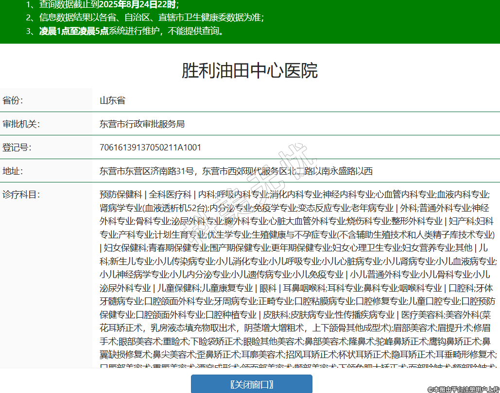省份:山東省審批機關(guān):東營市行政審批服務局登記號:70616139137050211A1001地址:東營市東營區(qū)濟南路31號,東營市西郊現(xiàn)代服務區(qū)北二路以南永盛路以西診療科目:預防保健科 | 全科醫(yī)療科 | 內(nèi)科;呼吸內(nèi)科專業(yè);消化內(nèi)科專業(yè);神經(jīng)內(nèi)科專業(yè);心血管內(nèi)科專業(yè);血液內(nèi)科專業(yè);腎病學專業(yè)(血液透析機52臺);內(nèi)分泌專業(yè);免疫學專業(yè);變態(tài)反應專業(yè);老年病專業(yè) | 外科;普通外科專業(yè);神經(jīng)外科專業(yè);骨科專業(yè);泌尿外科專業(yè);胸外科專業(yè);心臟大血管外科專業(yè);燒傷科專業(yè);整形外科專業(yè) | 婦產(chǎn)科;婦科專業(yè);產(chǎn)科專業(yè);計劃生育專業(yè);優(yōu)生學專業(yè);生殖健康與不孕癥專業(yè)(不含輔助生殖技術(shù)和人類精子庫技術(shù)專業(yè)) | 婦女保健科;青春期保健專業(yè);圍產(chǎn)期保健專業(yè);更年期保健專業(yè);婦女心理衛(wèi)生專業(yè);婦女營養(yǎng)專業(yè);其他 | 兒科;新生兒專業(yè);小兒傳染病專業(yè);小兒消化專業(yè);小兒呼吸專業(yè);小兒心臟病專業(yè);小兒腎病專業(yè);小兒血液病專業(yè);小兒神經(jīng)病學專業(yè);小兒內(nèi)分泌專業(yè);小兒遺傳病專業(yè);小兒免疫專業(yè) | 小兒普通外科專業(yè);小兒骨科專業(yè);小兒泌尿外科專業(yè) | 兒童保健科;兒童康復專業(yè) | 眼科 | 耳鼻咽喉科;耳科專業(yè);鼻科專業(yè);咽喉科專業(yè) | 口腔科;牙體牙髓病專業(yè);口腔頜面外科專業(yè);牙周病專業(yè);正畸專業(yè);口腔粘膜病專業(yè);口腔修復專業(yè);兒童口腔專業(yè);口腔預防保健專業(yè);口腔頜面外科專業(yè);口腔種植專業(yè) | 皮膚科;皮膚病專業(yè);性傳播疾病專業(yè) | 醫(yī)療美容科;美容外科(菜花耳矯正術(shù),乳房液態(tài)填充物取出術(shù),陰莖增大增粗術(shù),上下頜骨其他成型術(shù));眉部美容術(shù);眉提升術(shù);修眉手術(shù);眼部美容術(shù);重瞼術(shù);下瞼袋矯正術(shù);眼瞼其他美容術(shù);鼻部美容術(shù);隆鼻術(shù);駝峰鼻矯正術(shù);鷹鉤鼻矯正術(shù);鼻翼缺損修復術(shù);鼻尖美容術(shù);歪鼻矯正術(shù);耳廓美容術(shù);招風耳矯正術(shù);杯狀耳矯正術(shù);隱耳矯正術(shù);耳垂畸形修復術(shù);口唇部美容術(shù);重唇美容術(shù);酒窩成形術(shù);頜面部美容術(shù);顴部美容術(shù);下頜角肥大矯正術(shù);面部除皺術(shù);額部除皺術(shù);顳部除皺術(shù);中面部除皺術(shù);全面頸部除皺術(shù);內(nèi)窺鏡除皺術(shù);乳房美容術(shù);隆乳術(shù);乳頭內(nèi)陷矯正術(shù);乳房下垂矯正術(shù);乳頭乳暈重建術(shù);脂肪抽吸及腹壁成形術(shù);負壓脂肪抽吸術(shù);會陰部美容術(shù);處女膜修復術(shù);陰道松弛縮緊術(shù);陰蒂肥大縮小術(shù);小陰唇肥大縮小術(shù);包皮環(huán)切術(shù);陰莖延長術(shù);美容牙科(嵌體修復,覆蓋義齒美容修復,牙槽骨嵴修整術(shù),牙槽嵴增高術(shù),錯牙合畸形的診斷、分類和矯治設計,常見錯牙合畸形的矯治,正頜外科病例的正畸矯治);牙齒美容修復技術(shù);潔齒術(shù);牙齒修形術(shù);牙齒漂白術(shù);復合樹脂黏結(jié)修復技術(shù);瓷貼面修復技術(shù);樁冠修復技術(shù);金屬烤瓷冠橋修復技術(shù);全瓷冠技術(shù);自凝丙稀酸樹脂臨時冠技術(shù);可摘局部義齒美容修復技術(shù);全口義齒美容修復技術(shù);即刻義齒美容修復技術(shù);植牙美容修復技術(shù);黏結(jié)鑄造固定橋美容修復技術(shù);柔性義齦美容修復技術(shù);隱形義齒美容修復技術(shù);套筒冠義齒美容修復技術(shù);牙周美容技術(shù)操作;牙齦切除術(shù);牙齦成形術(shù);牙冠延長術(shù);根尖向復位瓣術(shù);側(cè)向轉(zhuǎn)位瓣術(shù);雙乳頭瓣移位術(shù);冠向復位瓣術(shù);自體游離齦瓣移植術(shù);牙周引導組織再生術(shù);牙槽骨修整術(shù);牙槽骨嵴修整術(shù);牙槽嵴增高術(shù);牙頜畸形美容矯治技術(shù);機械性活動性矯治器矯治技術(shù);功能性矯治器矯治技術(shù);固定矯治技術(shù);美容皮膚科(皮膚腫物切除,多汗癥治療,白癜風治療術(shù),體表小腫瘤切除術(shù),瘢痕切除縫合術(shù),皮膚擴張器技術(shù),紅外線治療,倒模及面部護理治療痤瘡、色斑及調(diào)節(jié)皮膚,冷噴治療敏感性皮膚,藥物導入調(diào)節(jié)膚質(zhì),藥浴治療敏感性皮膚,其他針對皮損或缺陷的無創(chuàng)治療);美容皮膚術(shù)(外科);診斷技術(shù);真菌鏡檢技術(shù);斑貼試驗技術(shù);皮膚活檢術(shù);治療技術(shù);糖皮質(zhì)激素皮損內(nèi)注射;藥物加壓治療;外用藥物治療;光化學療法;美容皮膚術(shù)(內(nèi)科);皮膚磨削術(shù);酒渣鼻切割術(shù);皮膚腫物切除術(shù);拔甲術(shù);刮除術(shù);自體表皮移植術(shù);腋臭手術(shù);足病修治術(shù);毛發(fā)移植術(shù) | 精神科;臨床心理專業(yè)(門診) | 傳染科;腸道傳染病專業(yè);呼吸道傳染病專業(yè);肝炎專業(yè);蟲媒傳染病專業(yè);動物源性傳染病專業(yè);蠕蟲病專業(yè) | 腫瘤科 | 急診醫(yī)學科 | 康復醫(yī)學科 | 運動醫(yī)學科 | 職業(yè)病科 | 特種醫(yī)學與軍事醫(yī)學科 | 麻醉科 | 疼痛科 | 重癥醫(yī)學科 | 醫(yī)學檢驗科;臨床體液、血液專業(yè);臨床微生物學專