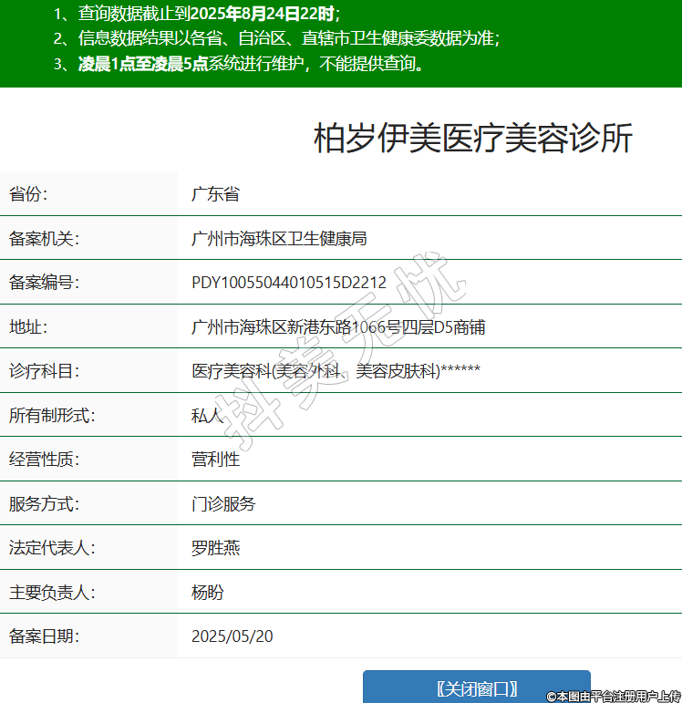 省份:廣東省備案機(jī)關(guān):廣州市海珠區(qū)衛(wèi)生健康局備案編號(hào):PDY10055044010515D2212地址:廣州市海珠區(qū)新港東路1066號(hào)四層D5商鋪診療科目:醫(yī)療美容科(美容外科、美容皮膚科)******所有制形式:私人經(jīng)營(yíng)性質(zhì):營(yíng)利性服務(wù)方式:門(mén)診服務(wù)法定代表人:羅勝燕主要負(fù)責(zé)人:楊盼備案日期:2025/05/20 -