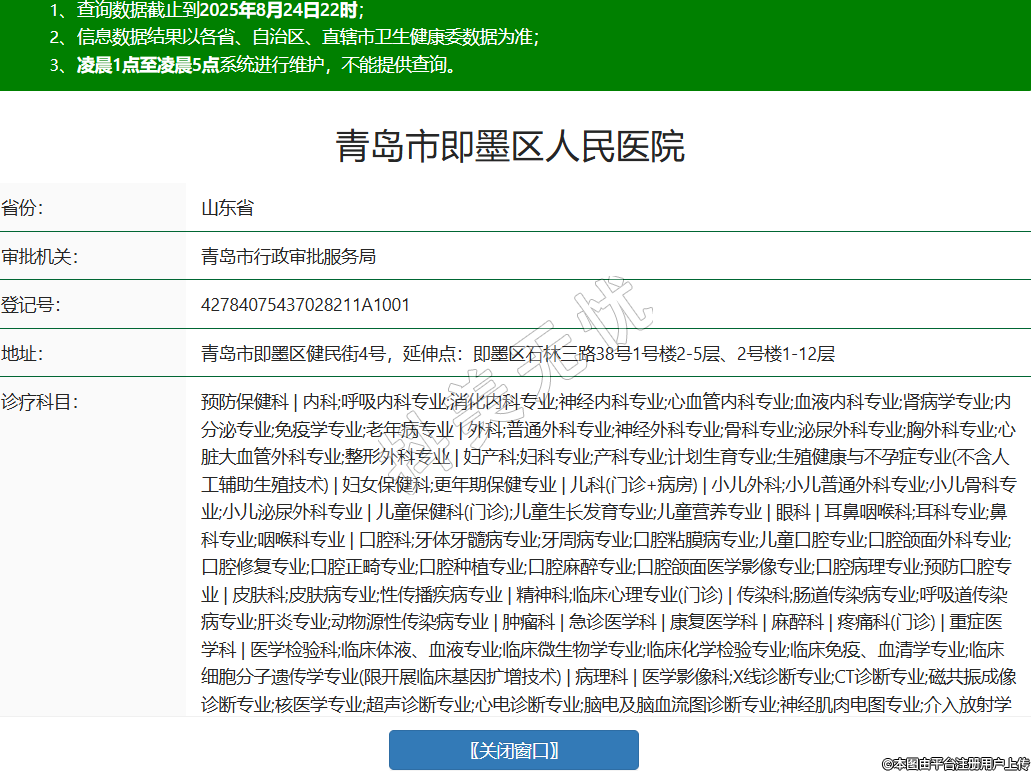 省份:山東省審批機(jī)關(guān):青島市行政審批服務(wù)局登記號:42784075437028211A1001地址:青島市即墨區(qū)健民街4號,延伸點(diǎn):即墨區(qū)石林三路38號1號樓2-5層、2號樓1-12層診療科目:預(yù)防保健科 | 內(nèi)科;呼吸內(nèi)科專業(yè);消化內(nèi)科專業(yè);神經(jīng)內(nèi)科專業(yè);心血管內(nèi)科專業(yè);血液內(nèi)科專業(yè);腎病學(xué)專業(yè);內(nèi)分泌專業(yè);免疫學(xué)專業(yè);老年病專業(yè) | 外科;普通外科專業(yè);神經(jīng)外科專業(yè);骨科專業(yè);泌尿外科專業(yè);胸外科專業(yè);心臟大血管外科專業(yè);整形外科專業(yè) | 婦產(chǎn)科;婦科專業(yè);產(chǎn)科專業(yè);計(jì)劃生育專業(yè);生殖健康與不孕癥專業(yè)(不含人工輔助生殖技術(shù)) | 婦女保健科;更年期保健專業(yè) | 兒科(門診+病房) | 小兒外科;小兒普通外科專業(yè);小兒骨科專業(yè);小兒泌尿外科專業(yè) | 兒童保健科(門診);兒童生長發(fā)育專業(yè);兒童營養(yǎng)專業(yè) | 眼科 | 耳鼻咽喉科;耳科專業(yè);鼻科專業(yè);咽喉科專業(yè) | 口腔科;牙體牙髓病專業(yè);牙周病專業(yè);口腔粘膜病專業(yè);兒童口腔專業(yè);口腔頜面外科專業(yè);口腔修復(fù)專業(yè);口腔正畸專業(yè);口腔種植專業(yè);口腔麻醉專業(yè);口腔頜面醫(yī)學(xué)影像專業(yè);口腔病理專業(yè);預(yù)防口腔專業(yè) | 皮膚科;皮膚病專業(yè);性傳播疾病專業(yè) | 精神科;臨床心理專業(yè)(門診) | 傳染科;腸道傳染病專業(yè);呼吸道傳染病專業(yè);肝炎專業(yè);動(dòng)物源性傳染病專業(yè) | 腫瘤科 | 急診醫(yī)學(xué)科 | 康復(fù)醫(yī)學(xué)科 | 麻醉科 | 疼痛科(門診) | 重癥醫(yī)學(xué)科 | 醫(yī)學(xué)檢驗(yàn)科;臨床體液、血液專業(yè);臨床微生物學(xué)專業(yè);臨床化學(xué)檢驗(yàn)專業(yè);臨床免疫、血清學(xué)專業(yè);臨床細(xì)胞分子遺傳學(xué)專業(yè)(限開展臨床基因擴(kuò)增技術(shù)) | 病理科 | 醫(yī)學(xué)影像科;X線診斷專業(yè);CT診斷專業(yè);磁共振成像診斷專業(yè);核醫(yī)學(xué)專業(yè);超聲診斷專業(yè);心電診斷專業(yè);腦電及腦血流圖診斷專業(yè);神經(jīng)肌肉電圖專業(yè);介入放射學(xué)專業(yè);放射治療專業(yè) | 中醫(yī)科;內(nèi)科專業(yè);外科專業(yè);婦產(chǎn)科專業(yè);骨傷科專業(yè);肛腸科專業(yè);針灸科專業(yè);推拿科專業(yè);康復(fù)醫(yī)學(xué)專業(yè)******級別:三級法定代表人:姜尊平主要負(fù)責(zé)人:宋啟京執(zhí)業(yè)許可證有效期:2018/09/19 -至- 2031/06/23 -