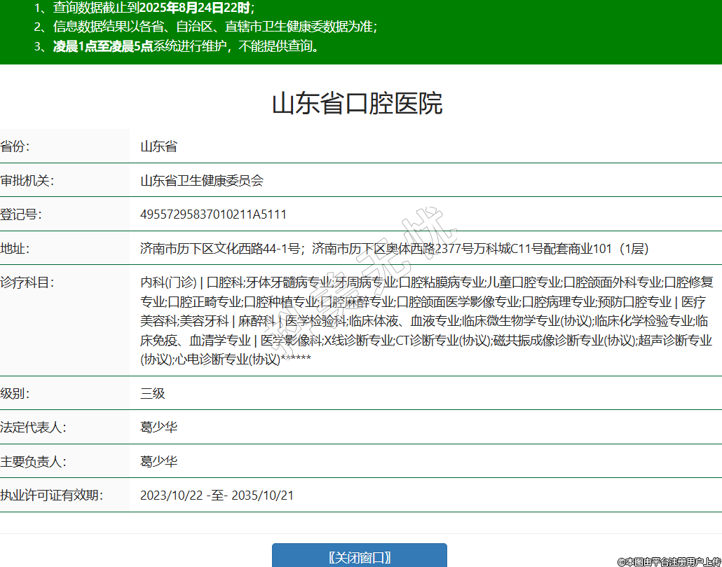 省份:山東省審批機(jī)關(guān):山東省衛(wèi)生健康委員會(huì)登記號(hào):49557295837010211A5111地址:濟(jì)南市歷下區(qū)文化西路44-1號(hào);濟(jì)南市歷下區(qū)奧體西路2377號(hào)萬科城C11號(hào)配套商業(yè)101(1層)診療科目:內(nèi)科(門診) | 口腔科;牙體牙髓病專業(yè);牙周病專業(yè);口腔粘膜病專業(yè);兒童口腔專業(yè);口腔頜面外科專業(yè);口腔修復(fù)專業(yè);口腔正畸專業(yè);口腔種植專業(yè);口腔麻醉專業(yè);口腔頜面醫(yī)學(xué)影像專業(yè);口腔病理專業(yè);預(yù)防口腔專業(yè) | 醫(yī)療美容科;美容牙科 | 麻醉科 | 醫(yī)學(xué)檢驗(yàn)科;臨床體液、血液專業(yè);臨床微生物學(xué)專業(yè)(協(xié)議);臨床化學(xué)檢驗(yàn)專業(yè);臨床免疫、血清學(xué)專業(yè) | 醫(yī)學(xué)影像科;X線診斷專業(yè);CT診斷專業(yè)(協(xié)議);磁共振成像診斷專業(yè)(協(xié)議);超聲診斷專業(yè)(協(xié)議);心電診斷專業(yè)(協(xié)議)******級(jí)別:三級(jí)法定代表人:葛少華主要負(fù)責(zé)人:葛少華執(zhí)業(yè)許可證有效期:2023/10/22 -至- 2035/10/21 -