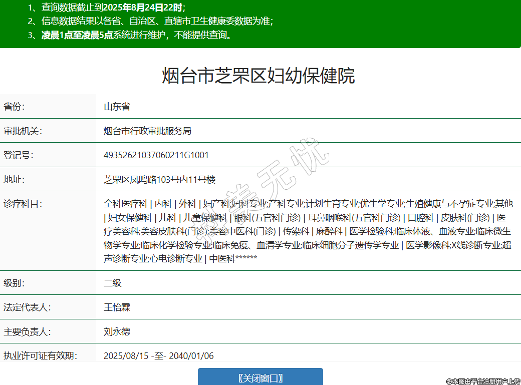 省份:山東省審批機關:煙臺市行政審批服務局登記號:49352621037060211G1001地址:芝罘區(qū)鳳鳴路103號內(nèi)11號樓診療科目:全科醫(yī)療科 | 內(nèi)科 | 外科 | 婦產(chǎn)科;婦科專業(yè);產(chǎn)科專業(yè);計劃生育專業(yè);優(yōu)生學專業(yè);生殖健康與不孕癥專業(yè);其他 | 婦女保健科 | 兒科 | 兒童保健科 | 眼科(五官科門診) | 耳鼻咽喉科(五官科門診) | 口腔科 | 皮膚科(門診) | 醫(yī)療美容科;美容皮膚科(門診);美容中醫(yī)科(門診) | 傳染科 | 麻醉科 | 醫(yī)學檢驗科;臨床體液、血液專業(yè);臨床微生物學專業(yè);臨床化學檢驗專業(yè);臨床免疫、血清學專業(yè);臨床細胞分子遺傳學專業(yè) | 醫(yī)學影像科;X線診斷專業(yè);超聲診斷專業(yè);心電診斷專業(yè) | 中醫(yī)科******級別:二級法定代表人:王怡霖主要負責人:劉永德執(zhí)業(yè)許可證有效期:2025/08/15 -至- 2040/01/06 -