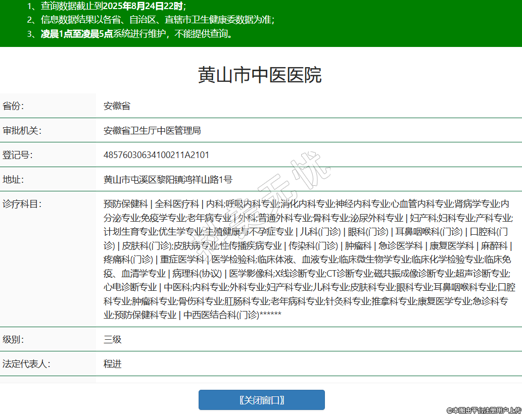 省份:安徽省審批機關(guān):安徽省衛(wèi)生廳中醫(yī)管理局登記號:48576030634100211A2101地址:黃山市屯溪區(qū)黎陽鎮(zhèn)鴻祥山路1號診療科目:預(yù)防保健科 | 全科醫(yī)療科 | 內(nèi)科;呼吸內(nèi)科專業(yè);消化內(nèi)科專業(yè);神經(jīng)內(nèi)科專業(yè);心血管內(nèi)科專業(yè);腎病學(xué)專業(yè);內(nèi)分泌專業(yè);免疫學(xué)專業(yè);老年病專業(yè) | 外科;普通外科專業(yè);骨科專業(yè);泌尿外科專業(yè) | 婦產(chǎn)科;婦科專業(yè);產(chǎn)科專業(yè);計劃生育專業(yè);優(yōu)生學(xué)專業(yè);生殖健康與不孕癥專業(yè) | 兒科(門診) | 眼科(門診) | 耳鼻咽喉科(門診) | 口腔科(門診) | 皮膚科(門診);皮膚病專業(yè);性傳播疾病專業(yè) | 傳染科(門診) | 腫瘤科 | 急診醫(yī)學(xué)科 | 康復(fù)醫(yī)學(xué)科 | 麻醉科 | 疼痛科(門診) | 重癥醫(yī)學(xué)科 | 醫(yī)學(xué)檢驗科;臨床體液、血液專業(yè);臨床微生物學(xué)專業(yè);臨床化學(xué)檢驗專業(yè);臨床免疫、血清學(xué)專業(yè) | 病理科(協(xié)議) | 醫(yī)學(xué)影像科;X線診斷專業(yè);CT診斷專業(yè);磁共振成像診斷專業(yè);超聲診斷專業(yè);心電診斷專業(yè) | 中醫(yī)科;內(nèi)科專業(yè);外科專業(yè);婦產(chǎn)科專業(yè);兒科專業(yè);皮膚科專業(yè);眼科專業(yè);耳鼻咽喉科專業(yè);口腔科專業(yè);腫瘤科專業(yè);骨傷科專業(yè);肛腸科專業(yè);老年病科專業(yè);針灸科專業(yè);推拿科專業(yè);康復(fù)醫(yī)學(xué)專業(yè);急診科專業(yè);預(yù)防保健科專業(yè) | 中西醫(yī)結(jié)合科(門診)******級別:三級法定代表人:程進主要負責人:程進執(zhí)業(yè)許可證有效期:2024/08/21 -至- 2039/08/20 -