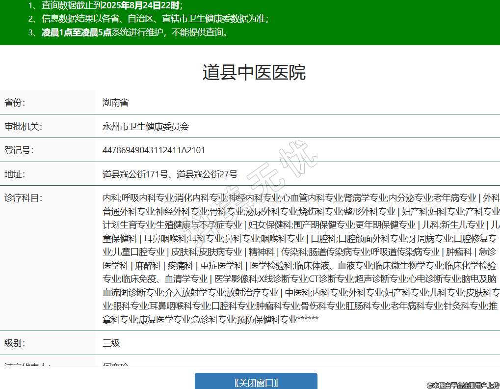 省份:湖南省審批機(jī)關(guān):永州市衛(wèi)生健康委員會登記號:44786949043112411A2101地址:道縣寇公街171號、道縣寇公街27號診療科目:內(nèi)科;呼吸內(nèi)科專業(yè);消化內(nèi)科專業(yè);神經(jīng)內(nèi)科專業(yè);心血管內(nèi)科專業(yè);腎病學(xué)專業(yè);內(nèi)分泌專業(yè);老年病專業(yè) | 外科;普通外科專業(yè);神經(jīng)外科專業(yè);骨科專業(yè);泌尿外科專業(yè);燒傷科專業(yè);整形外科專業(yè) | 婦產(chǎn)科;婦科專業(yè);產(chǎn)科專業(yè);計劃生育專業(yè);生殖健康與不孕癥專業(yè) | 婦女保健科;圍產(chǎn)期保健專業(yè);更年期保健專業(yè) | 兒科;新生兒專業(yè) | 兒童保健科 | 耳鼻咽喉科;耳科專業(yè);鼻科專業(yè);咽喉科專業(yè) | 口腔科;口腔頜面外科專業(yè);牙周病專業(yè);口腔修復(fù)專業(yè);兒童口腔專業(yè) | 皮膚科;皮膚病專業(yè) | 精神科 | 傳染科;腸道傳染病專業(yè);呼吸道傳染病專業(yè) | 腫瘤科 | 急診醫(yī)學(xué)科 | 麻醉科 | 疼痛科 | 重癥醫(yī)學(xué)科 | 醫(yī)學(xué)檢驗科;臨床體液、血液專業(yè);臨床微生物學(xué)專業(yè);臨床化學(xué)檢驗專業(yè);臨床免疫、血清學(xué)專業(yè) | 醫(yī)學(xué)影像科;X線診斷專業(yè);CT診斷專業(yè);超聲診斷專業(yè);心電診斷專業(yè);腦電及腦血流圖診斷專業(yè);介入放射學(xué)專業(yè);放射治療專業(yè) | 中醫(yī)科;內(nèi)科專業(yè);外科專業(yè);婦產(chǎn)科專業(yè);兒科專業(yè);皮膚科專業(yè);眼科專業(yè);耳鼻咽喉科專業(yè);口腔科專業(yè);腫瘤科專業(yè);骨傷科專業(yè);肛腸科專業(yè);老年病科專業(yè);針灸科專業(yè);推拿科專業(yè);康復(fù)醫(yī)學(xué)專業(yè);急診科專業(yè);預(yù)防保健科專業(yè)******級別:三級法定代表人:何鑾珍主要負(fù)責(zé)人:何鑾珍執(zhí)業(yè)許可證有效期:2018/09/29 -至- 2029/03/19 -