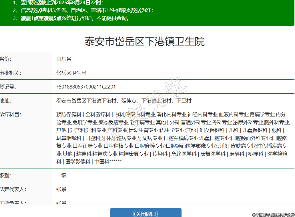 省份:山東省審批機關(guān):岱岳區(qū)衛(wèi)生局登記號:F5018880537090211C2201地址:泰安市岱岳區(qū)下港鎮(zhèn)下港村;延伸點:下港鎮(zhèn)上港村、下里村診療科目:預(yù)防保健科 | 全科醫(yī)療科 | 內(nèi)科;呼吸內(nèi)科專業(yè);消化內(nèi)科專業(yè);神經(jīng)內(nèi)科專業(yè);血液內(nèi)科專業(yè);腎病學(xué)專業(yè);內(nèi)分泌專業(yè);免疫學(xué)專業(yè);變態(tài)反應(yīng)專業(yè);老年病專業(yè);其他 | 外科;普通外科專業(yè);骨科專業(yè);泌尿外科專業(yè);胸外科專業(yè);其他 | 婦產(chǎn)科;婦科專業(yè);產(chǎn)科專業(yè);計劃生育專業(yè);優(yōu)生學(xué)專業(yè);其他 | 婦女保健科 | 兒科 | 兒童保健科 | 眼科 | 耳鼻咽喉科 | 口腔科;牙體牙髓病專業(yè);牙周病專業(yè);口腔粘膜病專業(yè);兒童口腔專業(yè);口腔頜面外科專業(yè);口腔修復(fù)專業(yè);口腔正畸專業(yè);口腔種植專業(yè);口腔麻醉專業(yè);口腔頜面醫(yī)學(xué)影像專業(yè);其他 | 皮膚病專業(yè);性傳播疾病專業(yè);其他 | 精神科;精神病專業(yè);精神康復(fù)專業(yè) | 傳染科 | 急診醫(yī)學(xué)科 | 康復(fù)醫(yī)學(xué)科 | 麻醉科 | 疼痛科 | 醫(yī)學(xué)檢驗科 | 醫(yī)學(xué)影像科 | 中醫(yī)科******級別:一級法定代表人:張景主要負責(zé)人:張景執(zhí)業(yè)許可證有效期:2024/11/11 -至- 2026/07/06 -