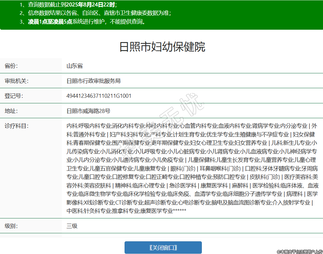 省份:山東省審批機關:日照市行政審批服務局登記號:49441234637110211G1001地址:日照市威海路28號診療科目:內科;呼吸內科專業(yè);消化內科專業(yè);神經內科專業(yè);心血管內科專業(yè);血液內科專業(yè);腎病學專業(yè);內分泌專業(yè) | 外科;普通外科專業(yè) | 婦產科;婦科專業(yè);產科專業(yè);計劃生育專業(yè);優(yōu)生學專業(yè);生殖健康與不孕癥專業(yè) | 婦女保健科;青春期保健專業(yè);圍產期保健專業(yè);更年期保健專業(yè);婦女心理衛(wèi)生專業(yè);婦女營養(yǎng)專業(yè) | 兒科;新生兒專業(yè);小兒傳染病專業(yè);小兒消化專業(yè);小兒呼吸專業(yè);小兒心臟病專業(yè);小兒腎病專業(yè);小兒血液病專業(yè);小兒神經病學專業(yè);小兒內分泌專業(yè);小兒遺傳病專業(yè);小兒免疫專業(yè) | 兒童保健科;兒童生長發(fā)育專業(yè);兒童營養(yǎng)專業(yè);兒童心理衛(wèi)生專業(yè);兒童五官保健專業(yè);兒童康復專業(yè) | 眼科(門診) | 耳鼻咽喉科(門診) | 口腔科;牙體牙髓病專業(yè);牙周病專業(yè);兒童口腔專業(yè);口腔修復專業(yè);口腔正畸專業(yè);口腔種植專業(yè);預防口腔專業(yè) | 皮膚科(門診) | 醫(yī)療美容科;美容外科;美容皮膚科 | 精神科;臨床心理專業(yè) | 急診醫(yī)學科 | 康復醫(yī)學科 | 麻醉科 | 醫(yī)學檢驗科;臨床體液、血液專業(yè);臨床微生物學專業(yè);臨床化學檢驗專業(yè);臨床免疫、血清學專業(yè);臨床細胞分子遺傳學專業(yè) | 病理科 | 醫(yī)學影像科;X線診斷專業(yè);CT診斷專業(yè);超聲診斷專業(yè);心電診斷專業(yè);腦電及腦血流圖診斷專業(yè);介入放射學專業(yè) | 中醫(yī)科;針灸科專業(yè);推拿科專業(yè);康復醫(yī)學專業(yè)******級別:三級法定代表人:牟善季主要負責人:徐祥文執(zhí)業(yè)許可證有效期:2025/04/17 -至- 2032/01/18 -