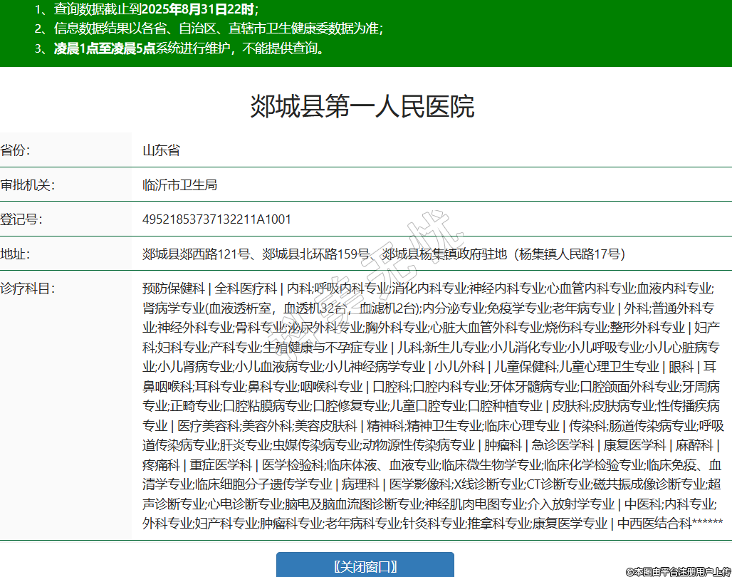 省份:山東省審批機(jī)關(guān):臨沂市衛(wèi)生局登記號(hào):49521853737132211A1001地址:郯城縣郯西路121號(hào)、郯城縣北環(huán)路159號(hào)、郯城縣楊集鎮(zhèn)政府駐地(楊集鎮(zhèn)人民路17號(hào))診療科目:預(yù)防保健科 | 全科醫(yī)療科 | 內(nèi)科;呼吸內(nèi)科專業(yè);消化內(nèi)科專業(yè);神經(jīng)內(nèi)科專業(yè);心血管內(nèi)科專業(yè);血液內(nèi)科專業(yè);腎病學(xué)專業(yè)(血液透析室,血透機(jī)32臺(tái),血濾機(jī)2臺(tái));內(nèi)分泌專業(yè);免疫學(xué)專業(yè);老年病專業(yè) | 外科;普通外科專業(yè);神經(jīng)外科專業(yè);骨科專業(yè);泌尿外科專業(yè);胸外科專業(yè);心臟大血管外科專業(yè);燒傷科專業(yè);整形外科專業(yè) | 婦產(chǎn)科;婦科專業(yè);產(chǎn)科專業(yè);生殖健康與不孕癥專業(yè) | 兒科;新生兒專業(yè);小兒消化專業(yè);小兒呼吸專業(yè);小兒心臟病專業(yè);小兒腎病專業(yè);小兒血液病專業(yè);小兒神經(jīng)病學(xué)專業(yè) | 小兒外科 | 兒童保健科;兒童心理衛(wèi)生專業(yè) | 眼科 | 耳鼻咽喉科;耳科專業(yè);鼻科專業(yè);咽喉科專業(yè) | 口腔科;口腔內(nèi)科專業(yè);牙體牙髓病專業(yè);口腔頜面外科專業(yè);牙周病專業(yè);正畸專業(yè);口腔粘膜病專業(yè);口腔修復(fù)專業(yè);兒童口腔專業(yè);口腔種植專業(yè) | 皮膚科;皮膚病專業(yè);性傳播疾病專業(yè) | 醫(yī)療美容科;美容外科;美容皮膚科 | 精神科;精神衛(wèi)生專業(yè);臨床心理專業(yè) | 傳染科;腸道傳染病專業(yè);呼吸道傳染病專業(yè);肝炎專業(yè);蟲媒傳染病專業(yè);動(dòng)物源性傳染病專業(yè) | 腫瘤科 | 急診醫(yī)學(xué)科 | 康復(fù)醫(yī)學(xué)科 | 麻醉科 | 疼痛科 | 重癥醫(yī)學(xué)科 | 醫(yī)學(xué)檢驗(yàn)科;臨床體液、血液專業(yè);臨床微生物學(xué)專業(yè);臨床化學(xué)檢驗(yàn)專業(yè);臨床免疫、血清學(xué)專業(yè);臨床細(xì)胞分子遺傳學(xué)專業(yè) | 病理科 | 醫(yī)學(xué)影像科;X線診斷專業(yè);CT診斷專業(yè);磁共振成像診斷專業(yè);超聲診斷專業(yè);心電診斷專業(yè);腦電及腦血流圖診斷專業(yè);神經(jīng)肌肉電圖專業(yè);介入放射學(xué)專業(yè) | 中醫(yī)科;內(nèi)科專業(yè);外科專業(yè);婦產(chǎn)科專業(yè);腫瘤科專業(yè);老年病科專業(yè);針灸科專業(yè);推拿科專業(yè);康復(fù)醫(yī)學(xué)專業(yè) | 中西醫(yī)結(jié)合科******級(jí)別:二級(jí)法定代表人:趙桂增主要負(fù)責(zé)人:李旭執(zhí)業(yè)許可證有效期:2025/07/04 -至- 2029/12/31 -