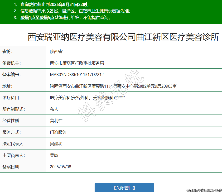 省份:陜西省備案機(jī)關(guān):西安市雁塔區(qū)行政審批服務(wù)局備案編號(hào):MAB0YNDB861011317D2212地址:陜西省西安市曲江新區(qū)雁展路1111號(hào)萊安中心第5幢2單元9層20903室診療科目:醫(yī)療美容科(美容外科,美容皮膚科)******所有制形式:私人經(jīng)營(yíng)性質(zhì):營(yíng)利性服務(wù)方式:門診服務(wù)法定代表人:吳建功主要負(fù)責(zé)人:吳敏備案日期:2025/05/08 -