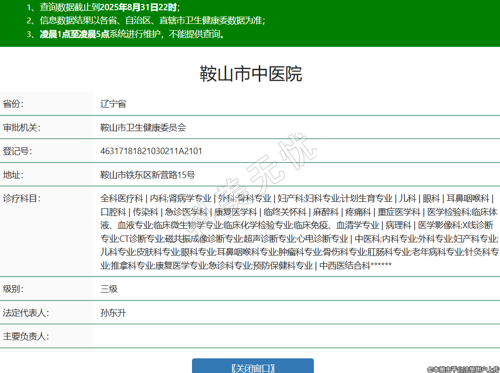 省份:遼寧省審批機關:鞍山市衛(wèi)生健康委員會登記號:46317181821030211A2101地址:鞍山市鐵東區(qū)新營路15號診療科目:全科醫(yī)療科 | 內科;腎病學專業(yè) | 外科;骨科專業(yè) | 婦產科;婦科專業(yè);計劃生育專業(yè) | 兒科 | 眼科 | 耳鼻咽喉科 | 口腔科 | 傳染科 | 急診醫(yī)學科 | 康復醫(yī)學科 | 臨終關懷科 | 麻醉科 | 疼痛科 | 重癥醫(yī)學科 | 醫(yī)學檢驗科;臨床體液、血液專業(yè);臨床微生物學專業(yè);臨床化學檢驗專業(yè);臨床免疫、血清學專業(yè) | 病理科 | 醫(yī)學影像科;X線診斷專業(yè);CT診斷專業(yè);磁共振成像診斷專業(yè);超聲診斷專業(yè);心電診斷專業(yè) | 中醫(yī)科;內科專業(yè);外科專業(yè);婦產科專業(yè);兒科專業(yè);皮膚科專業(yè);眼科專業(yè);耳鼻咽喉科專業(yè);腫瘤科專業(yè);骨傷科專業(yè);肛腸科專業(yè);老年病科專業(yè);針灸科專業(yè);推拿科專業(yè);康復醫(yī)學專業(yè);急診科專業(yè);預防保健科專業(yè) | 中西醫(yī)結合科******級別:三級法定代表人:孫東升主要負責人:執(zhí)業(yè)許可證有效期:2025/08/18 -至- 2031/07/31 -