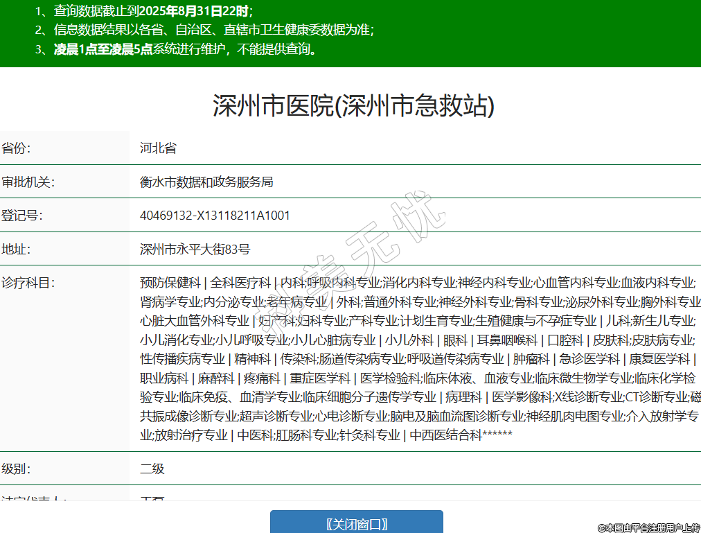 省份:河北省審批機關(guān):衡水市數(shù)據(jù)和政務(wù)服務(wù)局登記號:40469132-X13118211A1001地址:深州市永平大街83號診療科目:預(yù)防保健科 | 全科醫(yī)療科 | 內(nèi)科;呼吸內(nèi)科專業(yè);消化內(nèi)科專業(yè);神經(jīng)內(nèi)科專業(yè);心血管內(nèi)科專業(yè);血液內(nèi)科專業(yè);腎病學(xué)專業(yè);內(nèi)分泌專業(yè);老年病專業(yè) | 外科;普通外科專業(yè);神經(jīng)外科專業(yè);骨科專業(yè);泌尿外科專業(yè);胸外科專業(yè);心臟大血管外科專業(yè) | 婦產(chǎn)科;婦科專業(yè);產(chǎn)科專業(yè);計劃生育專業(yè);生殖健康與不孕癥專業(yè) | 兒科;新生兒專業(yè);小兒消化專業(yè);小兒呼吸專業(yè);小兒心臟病專業(yè) | 小兒外科 | 眼科 | 耳鼻咽喉科 | 口腔科 | 皮膚科;皮膚病專業(yè);性傳播疾病專業(yè) | 精神科 | 傳染科;腸道傳染病專業(yè);呼吸道傳染病專業(yè) | 腫瘤科 | 急診醫(yī)學(xué)科 | 康復(fù)醫(yī)學(xué)科 | 職業(yè)病科 | 麻醉科 | 疼痛科 | 重癥醫(yī)學(xué)科 | 醫(yī)學(xué)檢驗科;臨床體液、血液專業(yè);臨床微生物學(xué)專業(yè);臨床化學(xué)檢驗專業(yè);臨床免疫、血清學(xué)專業(yè);臨床細胞分子遺傳學(xué)專業(yè) | 病理科 | 醫(yī)學(xué)影像科;X線診斷專業(yè);CT診斷專業(yè);磁共振成像診斷專業(yè);超聲診斷專業(yè);心電診斷專業(yè);腦電及腦血流圖診斷專業(yè);神經(jīng)肌肉電圖專業(yè);介入放射學(xué)專業(yè);放射治療專業(yè) | 中醫(yī)科;肛腸科專業(yè);針灸科專業(yè) | 中西醫(yī)結(jié)合科******級別:二級法定代表人:王磊主要負(fù)責(zé)人:寇興執(zhí)業(yè)許可證有效期:2017/12/02 -至- 2032/12/01 -