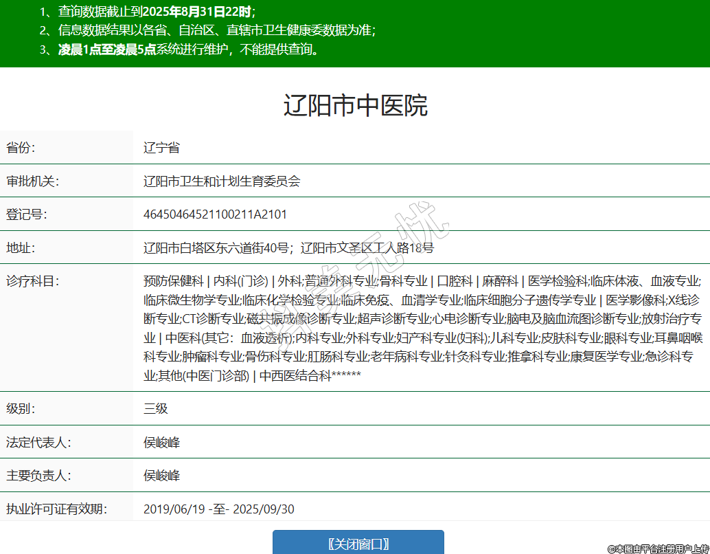 省份:遼寧省審批機(jī)關(guān):遼陽市衛(wèi)生和計(jì)劃生育委員會(huì)登記號:46450464521100211A2101地址:遼陽市白塔區(qū)東六道街40號;遼陽市文圣區(qū)工人路18號診療科目:預(yù)防保健科 | 內(nèi)科(門診) | 外科;普通外科專業(yè);骨科專業(yè) | 口腔科 | 麻醉科 | 醫(yī)學(xué)檢驗(yàn)科;臨床體液、血液專業(yè);臨床微生物學(xué)專業(yè);臨床化學(xué)檢驗(yàn)專業(yè);臨床免疫、血清學(xué)專業(yè);臨床細(xì)胞分子遺傳學(xué)專業(yè) | 醫(yī)學(xué)影像科;X線診斷專業(yè);CT診斷專業(yè);磁共振成像診斷專業(yè);超聲診斷專業(yè);心電診斷專業(yè);腦電及腦血流圖診斷專業(yè);放射治療專業(yè) | 中醫(yī)科(其它:血液透析);內(nèi)科專業(yè);外科專業(yè);婦產(chǎn)科專業(yè)(婦科);兒科專業(yè);皮膚科專業(yè);眼科專業(yè);耳鼻咽喉科專業(yè);腫瘤科專業(yè);骨傷科專業(yè);肛腸科專業(yè);老年病科專業(yè);針灸科專業(yè);推拿科專業(yè);康復(fù)醫(yī)學(xué)專業(yè);急診科專業(yè);其他(中醫(yī)門診部) | 中西醫(yī)結(jié)合科******級別:三級法定代表人:侯峻峰主要負(fù)責(zé)人:侯峻峰執(zhí)業(yè)許可證有效期:2019/06/19 -至- 2025/09/30 -