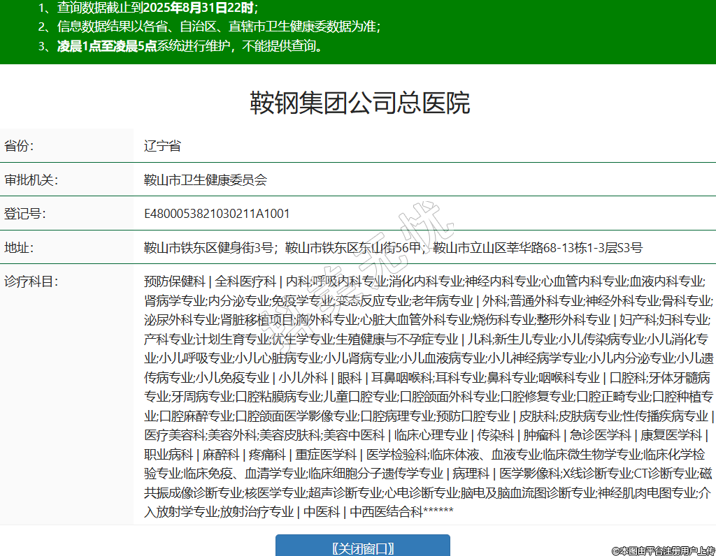 省份:遼寧省審批機關(guān):鞍山市衛(wèi)生健康委員會登記號:E4800053821030211A1001地址:鞍山市鐵東區(qū)健身街3號;鞍山市鐵東區(qū)東山街56甲;鞍山市立山區(qū)莘華路68-13棟1-3層S3號診療科目:預(yù)防保健科 | 全科醫(yī)療科 | 內(nèi)科;呼吸內(nèi)科專業(yè);消化內(nèi)科專業(yè);神經(jīng)內(nèi)科專業(yè);心血管內(nèi)科專業(yè);血液內(nèi)科專業(yè);腎病學(xué)專業(yè);內(nèi)分泌專業(yè);免疫學(xué)專業(yè);變態(tài)反應(yīng)專業(yè);老年病專業(yè) | 外科;普通外科專業(yè);神經(jīng)外科專業(yè);骨科專業(yè);泌尿外科專業(yè);腎臟移植項目;胸外科專業(yè);心臟大血管外科專業(yè);燒傷科專業(yè);整形外科專業(yè) | 婦產(chǎn)科;婦科專業(yè);產(chǎn)科專業(yè);計劃生育專業(yè);優(yōu)生學(xué)專業(yè);生殖健康與不孕癥專業(yè) | 兒科;新生兒專業(yè);小兒傳染病專業(yè);小兒消化專業(yè);小兒呼吸專業(yè);小兒心臟病專業(yè);小兒腎病專業(yè);小兒血液病專業(yè);小兒神經(jīng)病學(xué)專業(yè);小兒內(nèi)分泌專業(yè);小兒遺傳病專業(yè);小兒免疫專業(yè) | 小兒外科 | 眼科 | 耳鼻咽喉科;耳科專業(yè);鼻科專業(yè);咽喉科專業(yè) | 口腔科;牙體牙髓病專業(yè);牙周病專業(yè);口腔粘膜病專業(yè);兒童口腔專業(yè);口腔頜面外科專業(yè);口腔修復(fù)專業(yè);口腔正畸專業(yè);口腔種植專業(yè);口腔麻醉專業(yè);口腔頜面醫(yī)學(xué)影像專業(yè);口腔病理專業(yè);預(yù)防口腔專業(yè) | 皮膚科;皮膚病專業(yè);性傳播疾病專業(yè) | 醫(yī)療美容科;美容外科;美容皮膚科;美容中醫(yī)科 | 臨床心理專業(yè) | 傳染科 | 腫瘤科 | 急診醫(yī)學(xué)科 | 康復(fù)醫(yī)學(xué)科 | 職業(yè)病科 | 麻醉科 | 疼痛科 | 重癥醫(yī)學(xué)科 | 醫(yī)學(xué)檢驗科;臨床體液、血液專業(yè);臨床微生物學(xué)專業(yè);臨床化學(xué)檢驗專業(yè);臨床免疫、血清學(xué)專業(yè);臨床細(xì)胞分子遺傳學(xué)專業(yè) | 病理科 | 醫(yī)學(xué)影像科;X線診斷專業(yè);CT診斷專業(yè);磁共振成像診斷專業(yè);核醫(yī)學(xué)專業(yè);超聲診斷專業(yè);心電診斷專業(yè);腦電及腦血流圖診斷專業(yè);神經(jīng)肌肉電圖專業(yè);介入放射學(xué)專業(yè);放射治療專業(yè) | 中醫(yī)科 | 中西醫(yī)結(jié)合科******級別:三級法定代表人:劉欣主要負(fù)責(zé)人:執(zhí)業(yè)許可證有效期:2025/07/10 -至- 2032/08/08 -