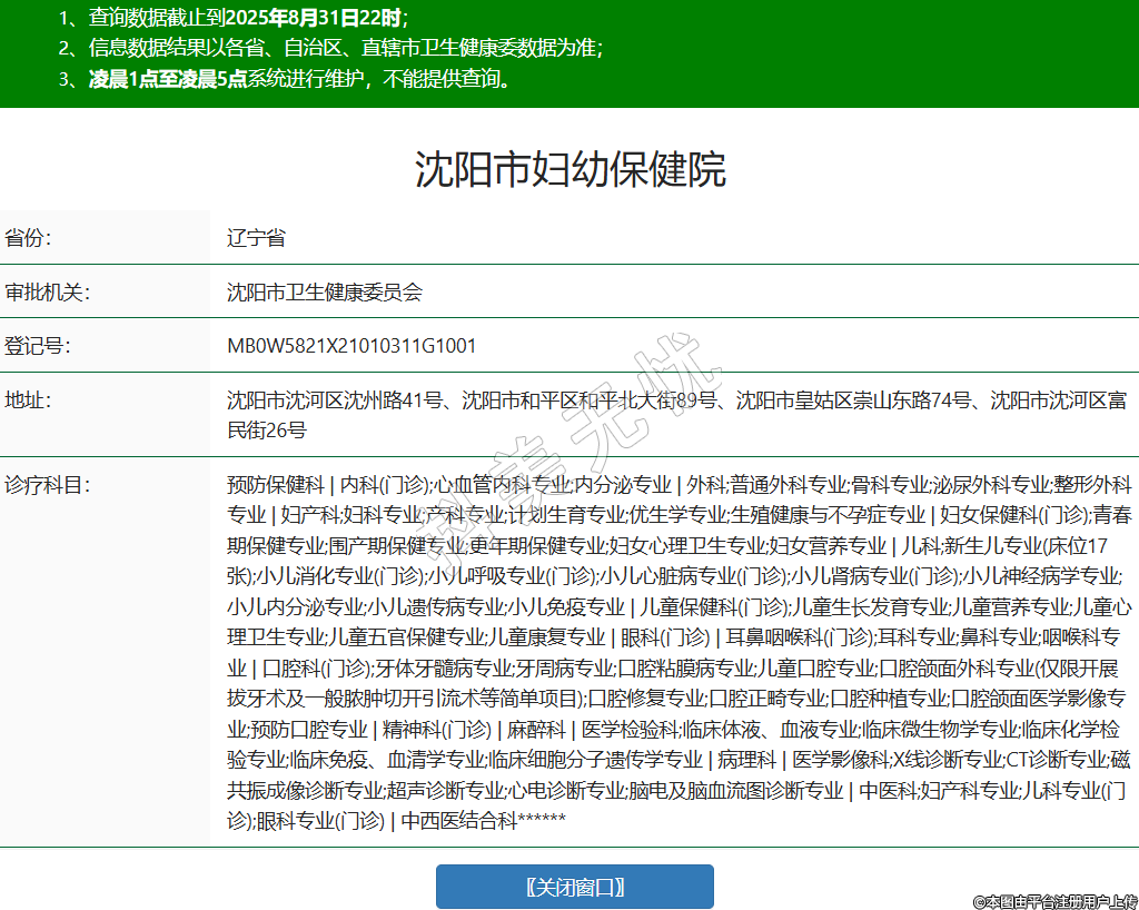 省份:遼寧省審批機關:沈陽市衛(wèi)生健康委員會登記號:MB0W5821X21010311G1001地址:沈陽市沈河區(qū)沈州路41號、沈陽市和平區(qū)和平北大街89號、沈陽市皇姑區(qū)崇山東路74號、沈陽市沈河區(qū)富民街26號診療科目:預防保健科 | 內(nèi)科(門診);心血管內(nèi)科專業(yè);內(nèi)分泌專業(yè) | 外科;普通外科專業(yè);骨科專業(yè);泌尿外科專業(yè);整形外科專業(yè) | 婦產(chǎn)科;婦科專業(yè);產(chǎn)科專業(yè);計劃生育專業(yè);優(yōu)生學專業(yè);生殖健康與不孕癥專業(yè) | 婦女保健科(門診);青春期保健專業(yè);圍產(chǎn)期保健專業(yè);更年期保健專業(yè);婦女心理衛(wèi)生專業(yè);婦女營養(yǎng)專業(yè) | 兒科;新生兒專業(yè)(床位17張);小兒消化專業(yè)(門診);小兒呼吸專業(yè)(門診);小兒心臟病專業(yè)(門診);小兒腎病專業(yè)(門診);小兒神經(jīng)病學專業(yè);小兒內(nèi)分泌專業(yè);小兒遺傳病專業(yè);小兒免疫專業(yè) | 兒童保健科(門診);兒童生長發(fā)育專業(yè);兒童營養(yǎng)專業(yè);兒童心理衛(wèi)生專業(yè);兒童五官保健專業(yè);兒童康復專業(yè) | 眼科(門診) | 耳鼻咽喉科(門診);耳科專業(yè);鼻科專業(yè);咽喉科專業(yè) | 口腔科(門診);牙體牙髓病專業(yè);牙周病專業(yè);口腔粘膜病專業(yè);兒童口腔專業(yè);口腔頜面外科專業(yè)(僅限開展拔牙術及一般膿腫切開引流術等簡單項目);口腔修復專業(yè);口腔正畸專業(yè);口腔種植專業(yè);口腔頜面醫(yī)學影像專業(yè);預防口腔專業(yè) | 精神科(門診) | 麻醉科 | 醫(yī)學檢驗科;臨床體液、血液專業(yè);臨床微生物學專業(yè);臨床化學檢驗專業(yè);臨床免疫、血清學專業(yè);臨床細胞分子遺傳學專業(yè) | 病理科 | 醫(yī)學影像科;X線診斷專業(yè);CT診斷專業(yè);磁共振成像診斷專業(yè);超聲診斷專業(yè);心電診斷專業(yè);腦電及腦血流圖診斷專業(yè) | 中醫(yī)科;婦產(chǎn)科專業(yè);兒科專業(yè)(門診);眼科專業(yè)(門診) | 中西醫(yī)結合科******級別:三級法定代表人:李晨陽主要負責人:李晨陽執(zhí)業(yè)許可證有效期:2023/11/01 -至- 2030/05/31 -